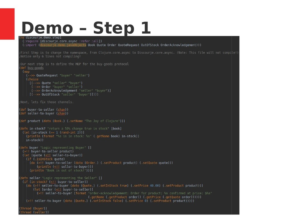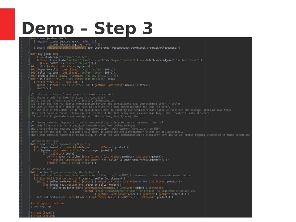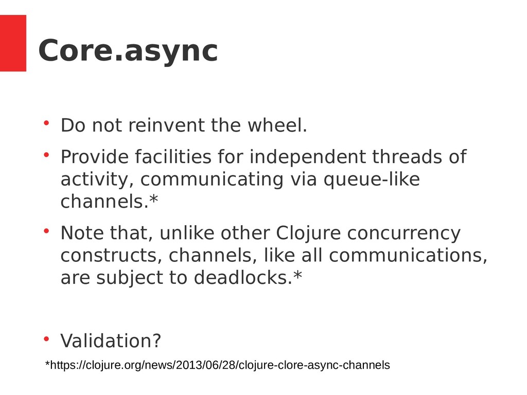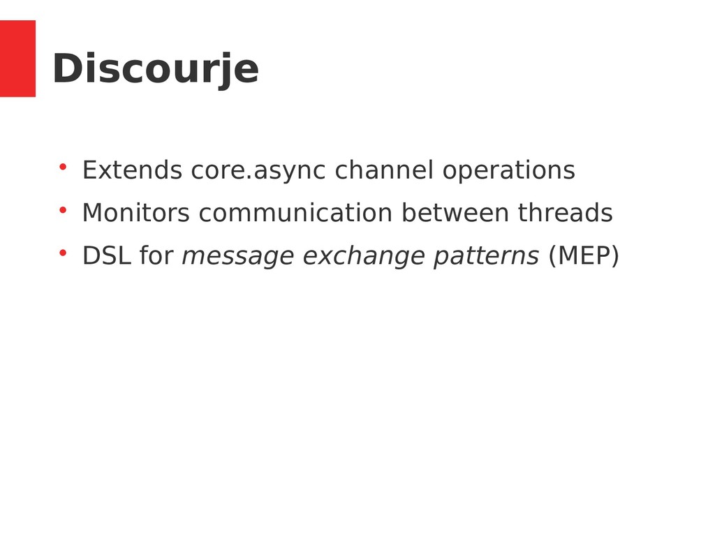 The core.async library provides many high-level features for async programming, but does not protect against classical concurrency problems. Discourje extends core.async and offers high-level abstractions to define message exchange patterns that are run-time validated and enforced between threads.