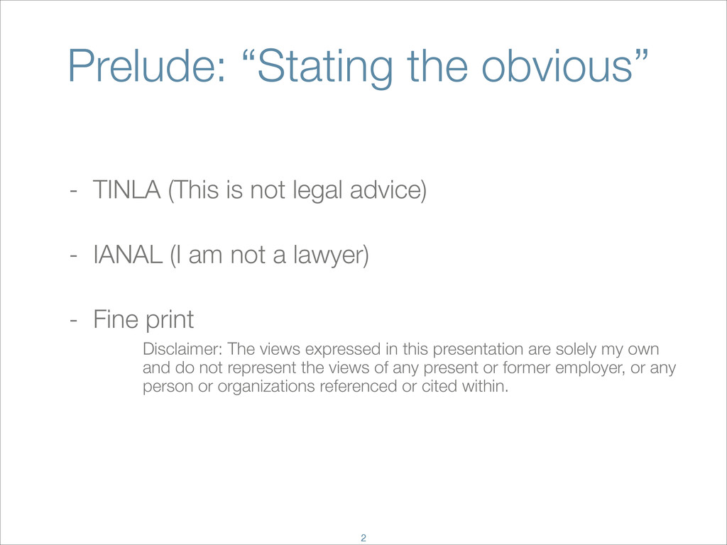 (I am not a lawyer) ! - Fine print Disclaimer: The views expressed in this presentation are solely my own and do not represent the views of any present or former employer, or any person or organizations referenced or cited within. 2 Prelude: “Stating the obvious”