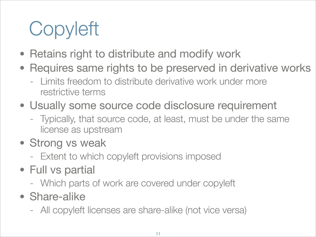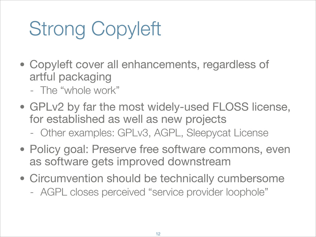 Requires same rights to be preserved in derivative works - Limits freedom to distribute derivative work under more restrictive terms • Usually some source code disclosure requirement - Typically, that source code, at least, must be under the same license as upstream • Strong vs weak - Extent to which copyleft provisions imposed • Full vs partial - Which parts of work are covered under copyleft • Share-alike - All copyleft licenses are share-alike (not vice versa) 11
