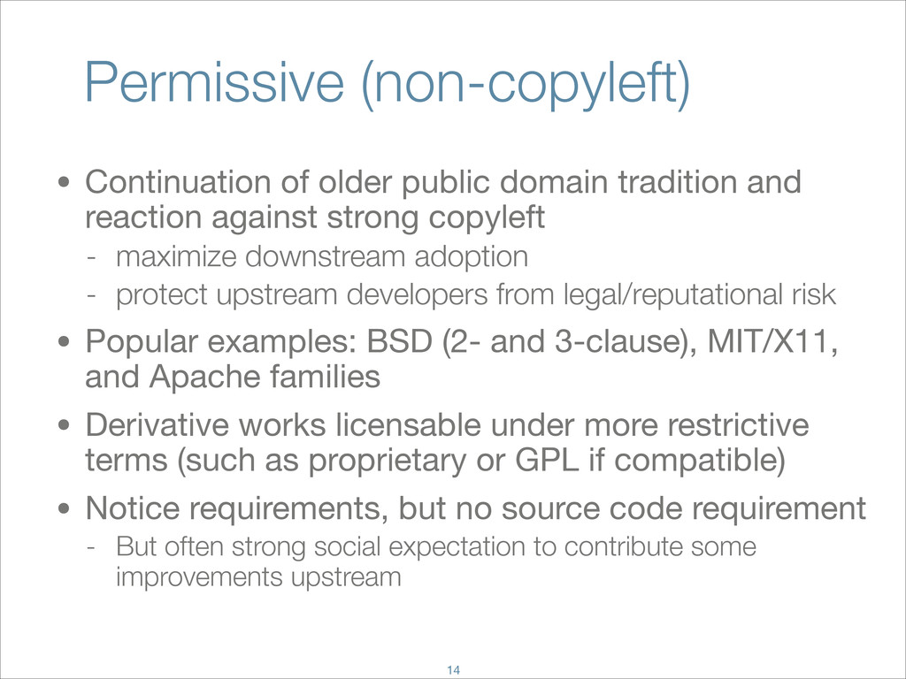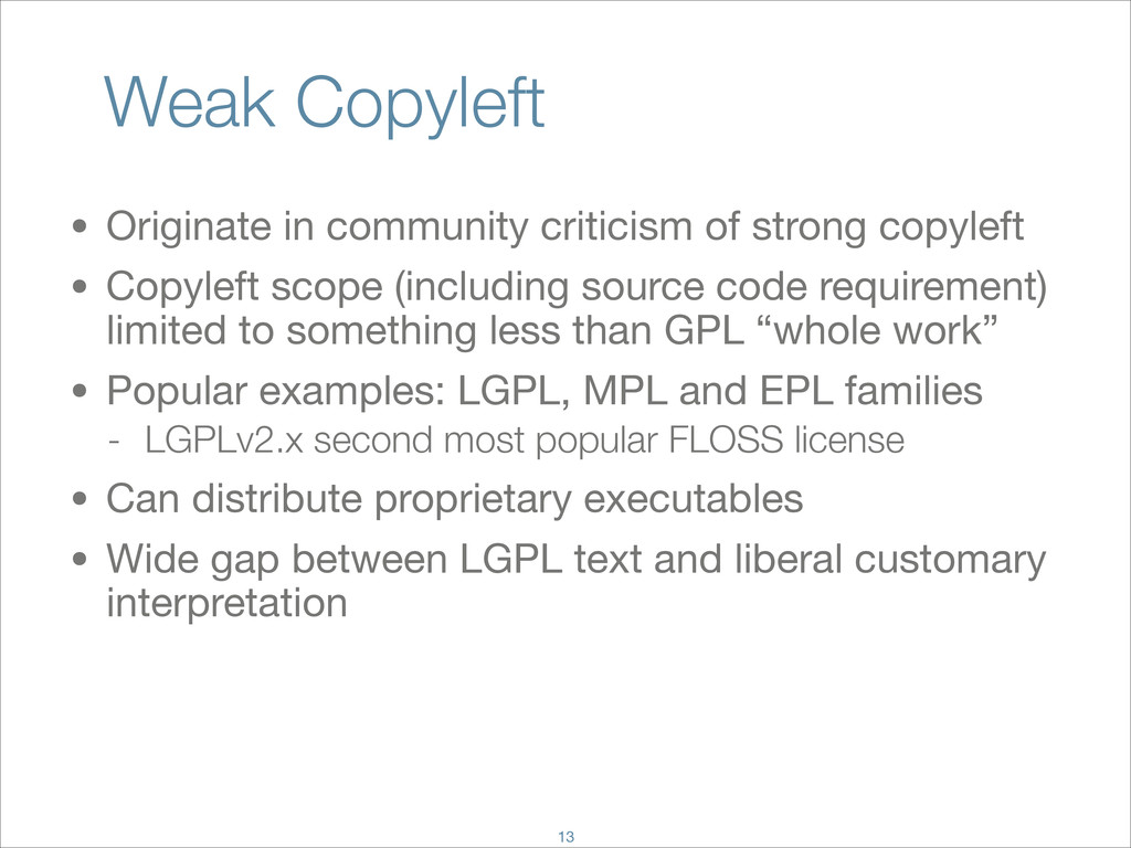 • Copyleft scope (including source code requirement) limited to something less than GPL “whole work” • Popular examples: LGPL, MPL and EPL families - LGPLv2.x second most popular FLOSS license • Can distribute proprietary executables • Wide gap between LGPL text and liberal customary interpretation 13