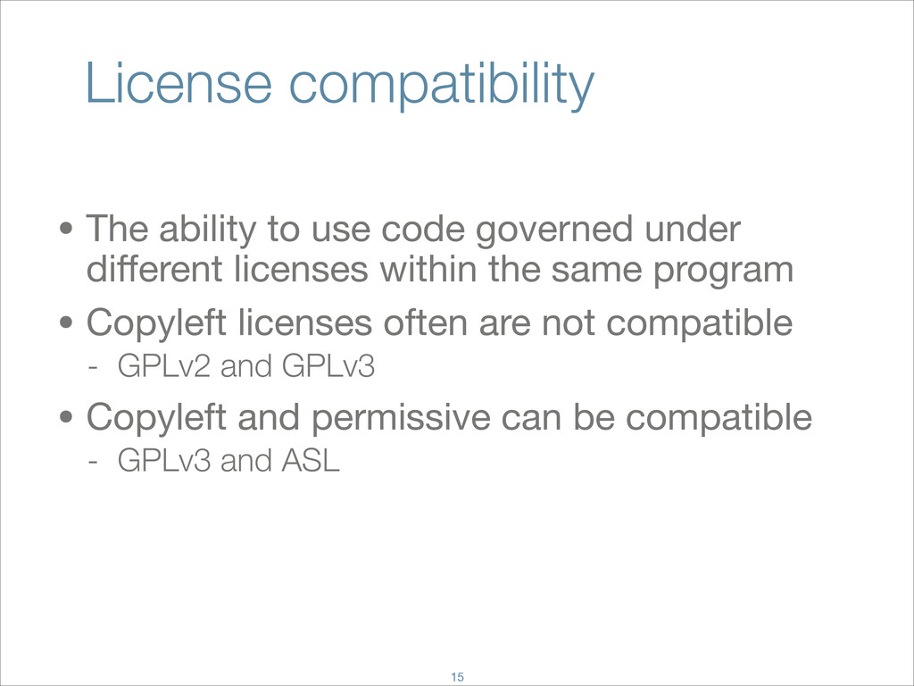 licenses within the same program • Copyleft licenses often are not compatible - GPLv2 and GPLv3 • Copyleft and permissive can be compatible - GPLv3 and ASL 15 License compatibility