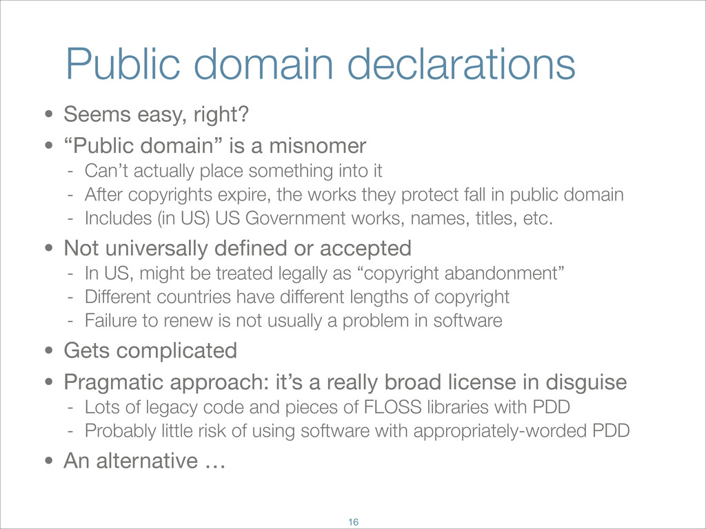 is a misnomer - Can’t actually place something into it - After copyrights expire, the works they protect fall in public domain - Includes (in US) US Government works, names, titles, etc. • Not universally defined or accepted - In US, might be treated legally as “copyright abandonment” - Different countries have different lengths of copyright - Failure to renew is not usually a problem in software • Gets complicated • Pragmatic approach: it’s a really broad license in disguise - Lots of legacy code and pieces of FLOSS libraries with PDD - Probably little risk of using software with appropriately-worded PDD • An alternative … 16