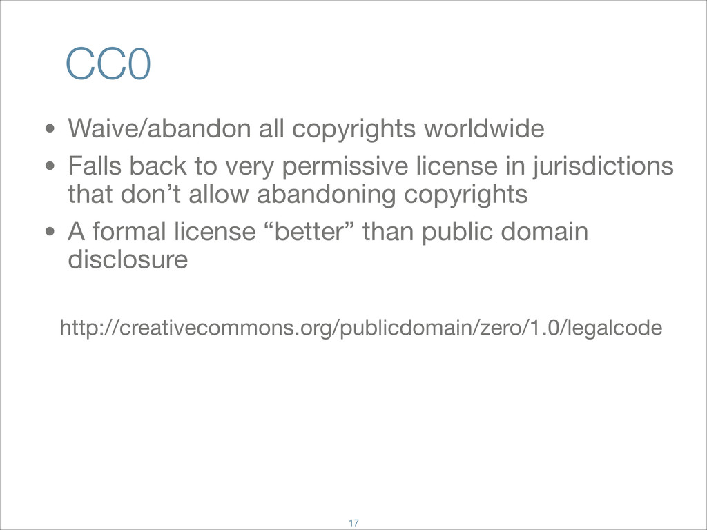 very permissive license in jurisdictions that don’t allow abandoning copyrights • A formal license “better” than public domain disclosure ! http://creativecommons.org/publicdomain/zero/1.0/legalcode 17