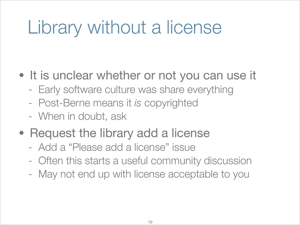 not you can use it - Early software culture was share everything - Post-Berne means it is copyrighted - When in doubt, ask • Request the library add a license - Add a “Please add a license” issue - Often this starts a useful community discussion - May not end up with license acceptable to you 19