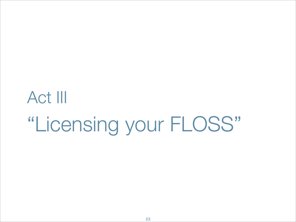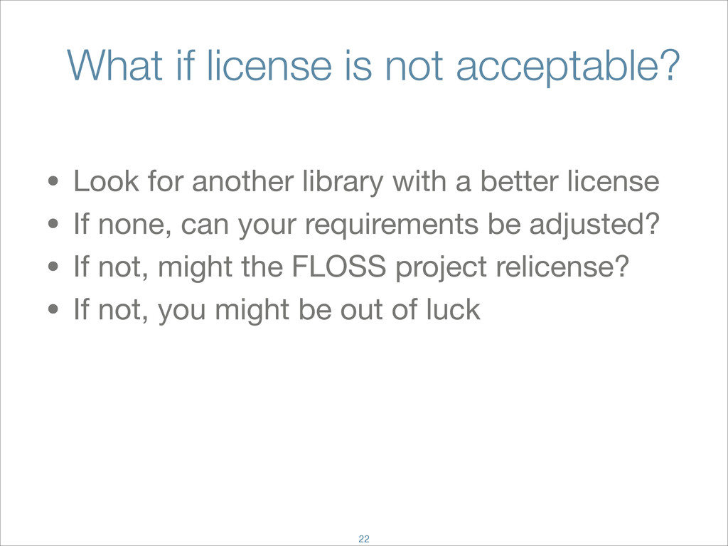 library with a better license • If none, can your requirements be adjusted? • If not, might the FLOSS project relicense? • If not, you might be out of luck 22