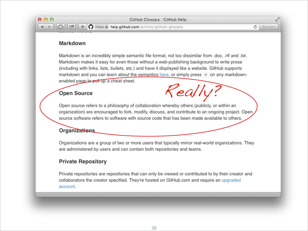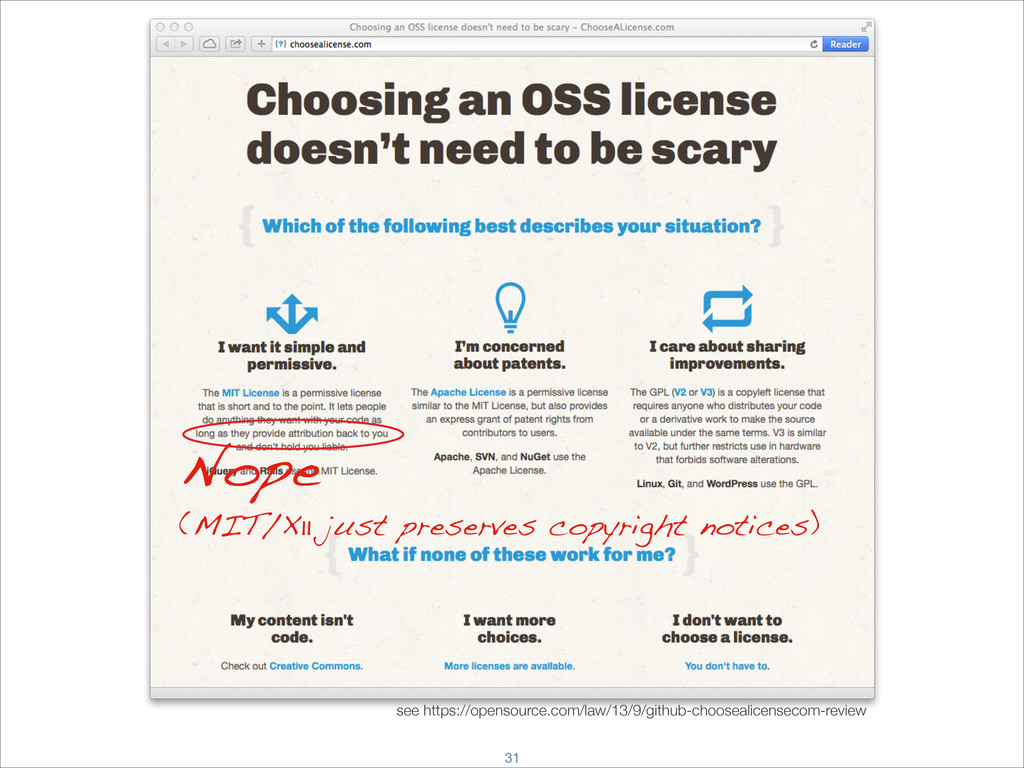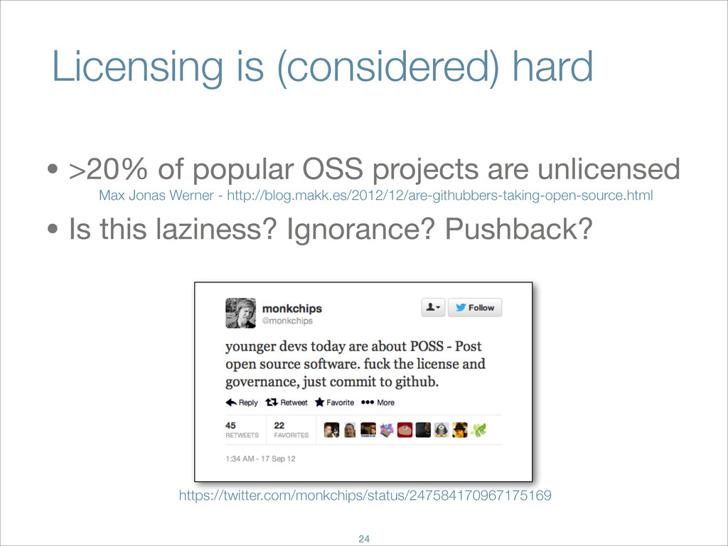 Werner - http://blog.makk.es/2012/12/are-githubbers-taking-open-source.html • Is this laziness? Ignorance? Pushback? 24 Licensing is (considered) hard https://twitter.com/monkchips/status/247584170967175169