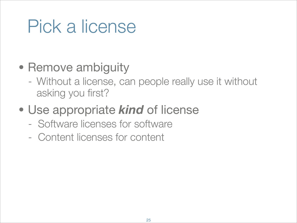 sites - can be helpful - but “plain English” often masks important legal details • Read and understand the actual license • Consider how license will affect - the license of other libraries you’re using - your code’s license - distributing your code 20