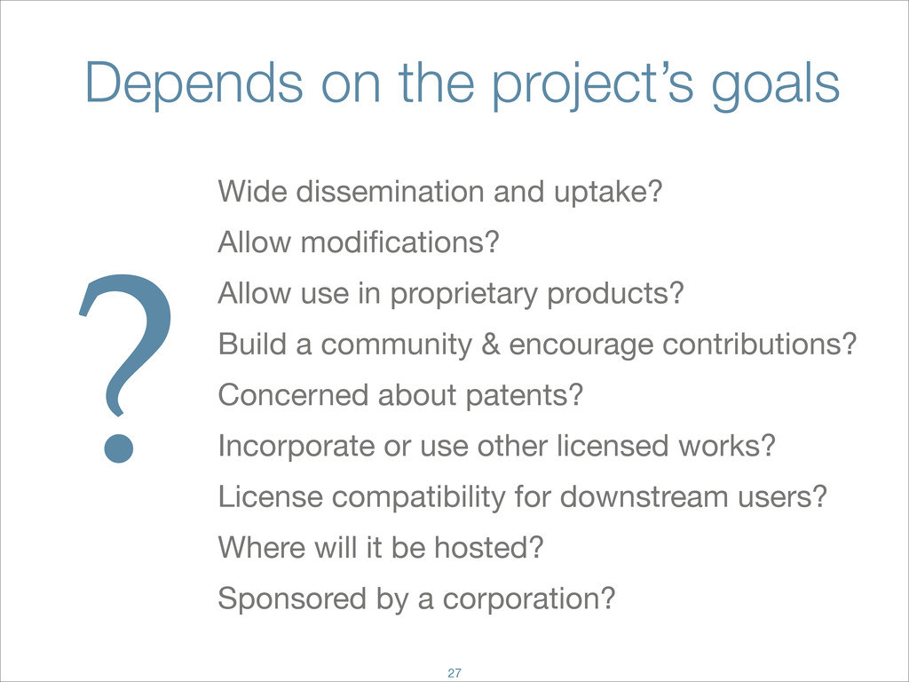 modifications? Allow use in proprietary products? Build a community & encourage contributions? Concerned about patents? Incorporate or use other licensed works? License compatibility for downstream users? Where will it be hosted? Sponsored by a corporation? 27 ?