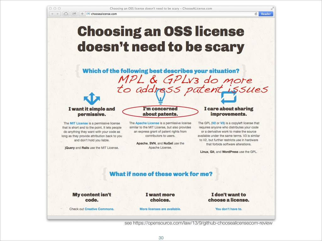 categorize - can be helpful - but “plain English” often masks important legal details • Watch out for political or business agendas - favor some types of licenses over others - alternative definitions of accepted concepts ! Attempts to simplify can introduce errors… 28