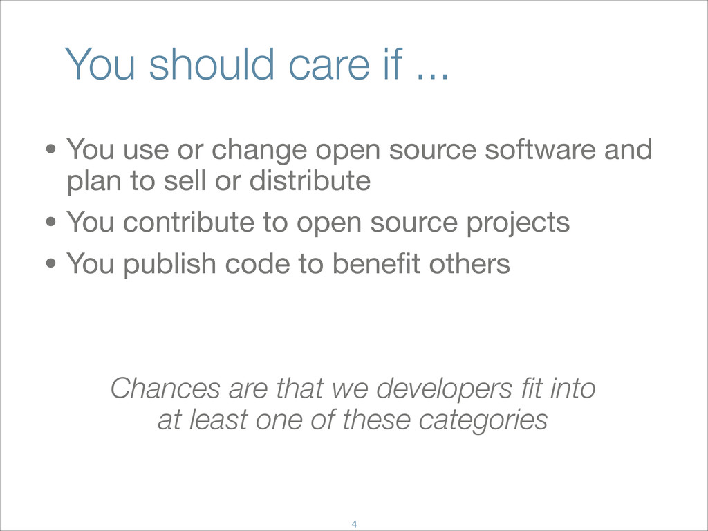 change open source software and plan to sell or distribute • You contribute to open source projects • You publish code to benefit others ! ! Chances are that we developers fit into at least one of these categories