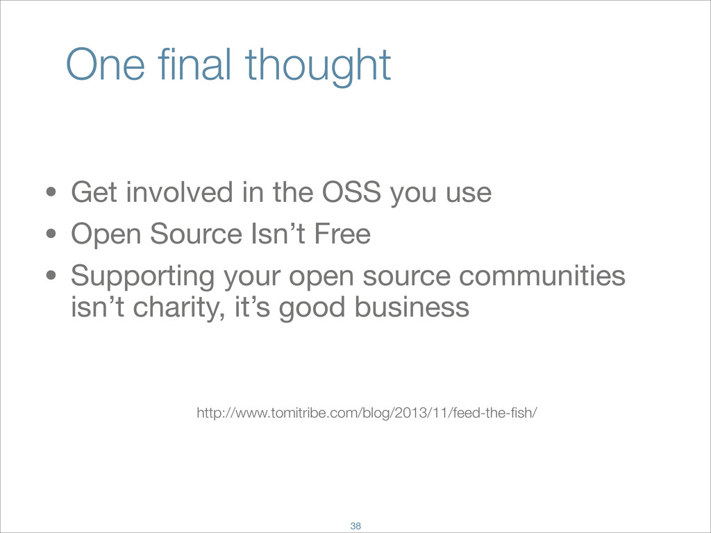 use • Open Source Isn’t Free • Supporting your open source communities isn’t charity, it’s good business ! ! http://www.tomitribe.com/blog/2013/11/feed-the-fish/ 38