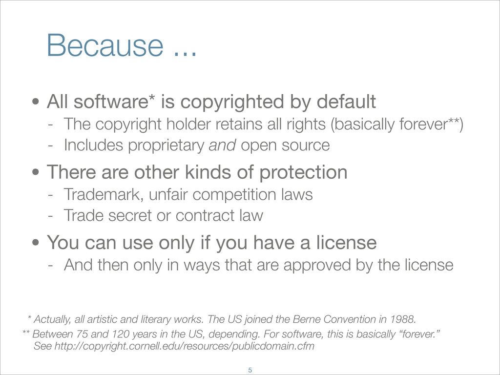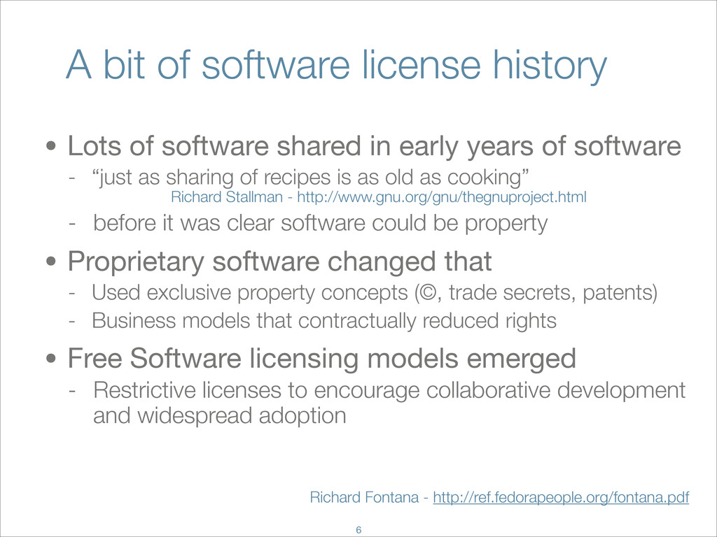 The copyright holder retains all rights (basically forever**) - Includes proprietary and open source • There are other kinds of protection - Trademark, unfair competition laws - Trade secret or contract law • You can use only if you have a license - And then only in ways that are approved by the license 5 * Actually, all artistic and literary works. The US joined the Berne Convention in 1988. ** Between 75 and 120 years in the US, depending. For software, this is basically “forever.” See http://copyright.cornell.edu/resources/publicdomain.cfm