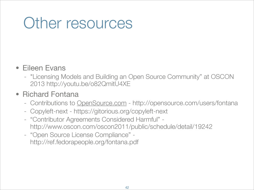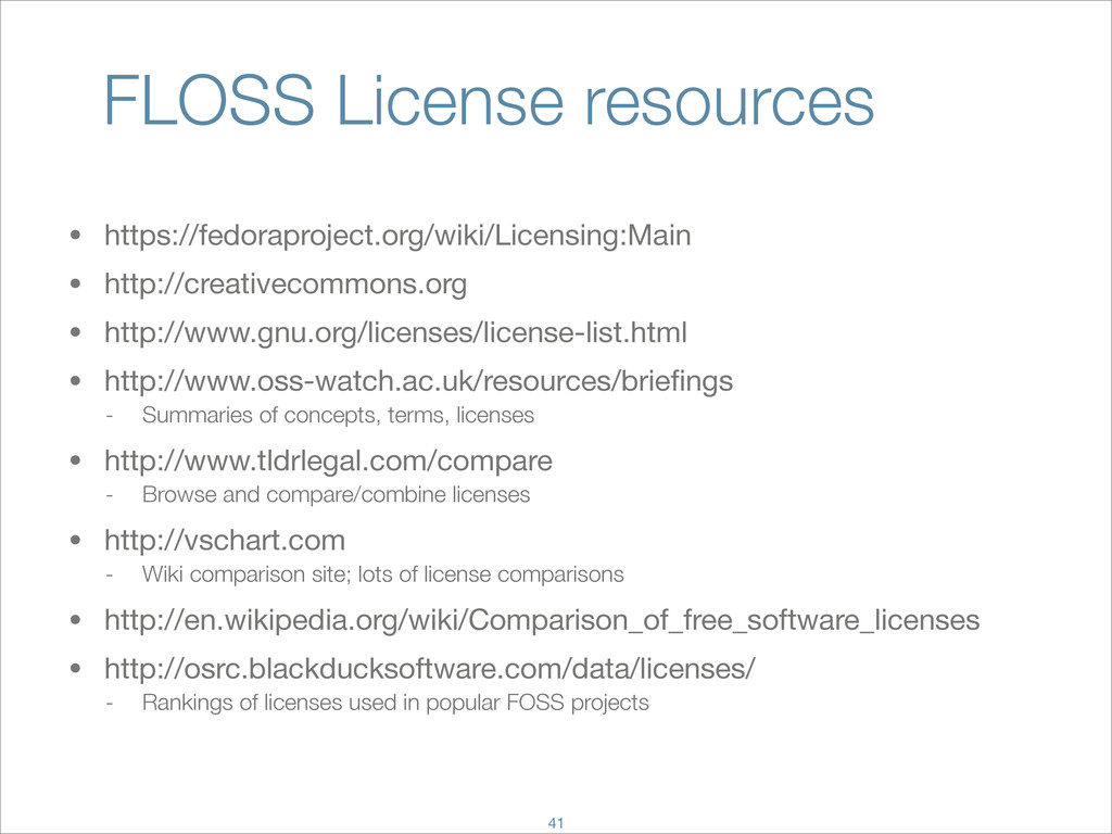http://www.oss-watch.ac.uk/resources/briefings - Summaries of concepts, terms, licenses • http://www.tldrlegal.com/compare - Browse and compare/combine licenses • http://vschart.com - Wiki comparison site; lots of license comparisons • http://en.wikipedia.org/wiki/Comparison_of_free_software_licenses • http://osrc.blackducksoftware.com/data/licenses/ - Rankings of licenses used in popular FOSS projects 41