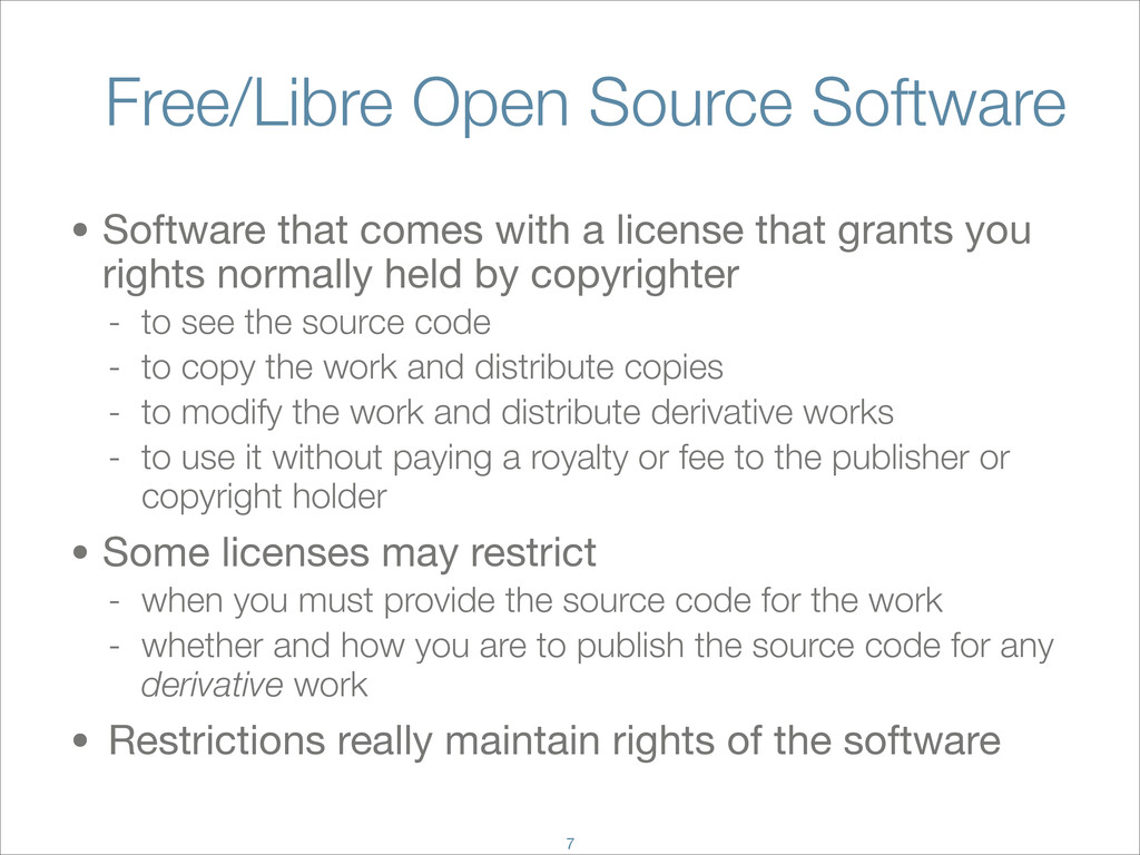 license that grants you rights normally held by copyrighter - to see the source code - to copy the work and distribute copies - to modify the work and distribute derivative works - to use it without paying a royalty or fee to the publisher or copyright holder • Some licenses may restrict - when you must provide the source code for the work - whether and how you are to publish the source code for any derivative work • Restrictions really maintain rights of the software 7