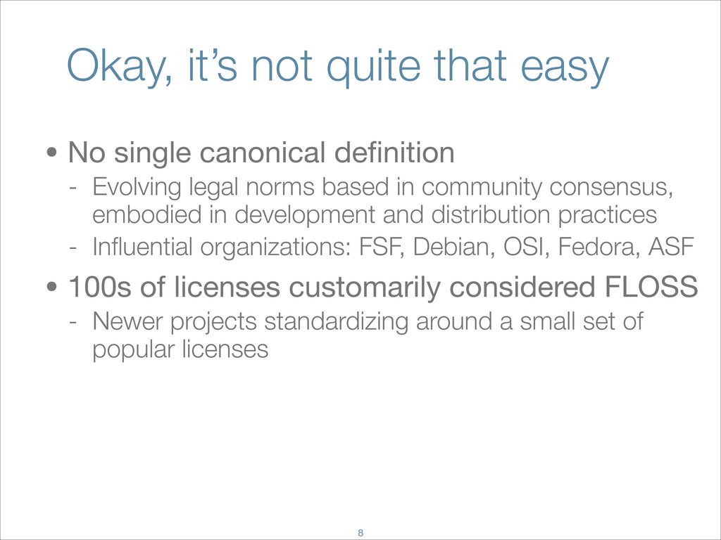 definition - Evolving legal norms based in community consensus, embodied in development and distribution practices - Influential organizations: FSF, Debian, OSI, Fedora, ASF • 100s of licenses customarily considered FLOSS - Newer projects standardizing around a small set of popular licenses 8
