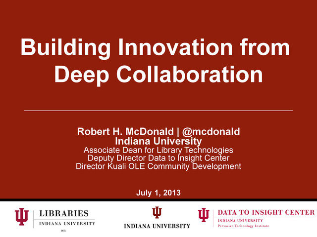 McDonald | @mcdonald Indiana University Associate Dean for Library Technologies Deputy Director Data to Insight Center Director Kuali OLE Community Development