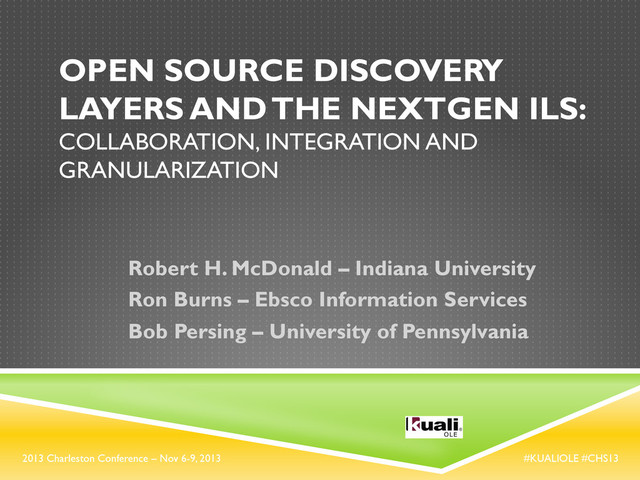 2013 OPEN SOURCE DISCOVERY LAYERS AND THE NEXTGEN ILS: COLLABORATION, INTEGRATION AND GRANULARIZATION Robert H. McDonald – Indiana University Ron Burns – Ebsco Information Services Bob Persing – University of Pennsylvania