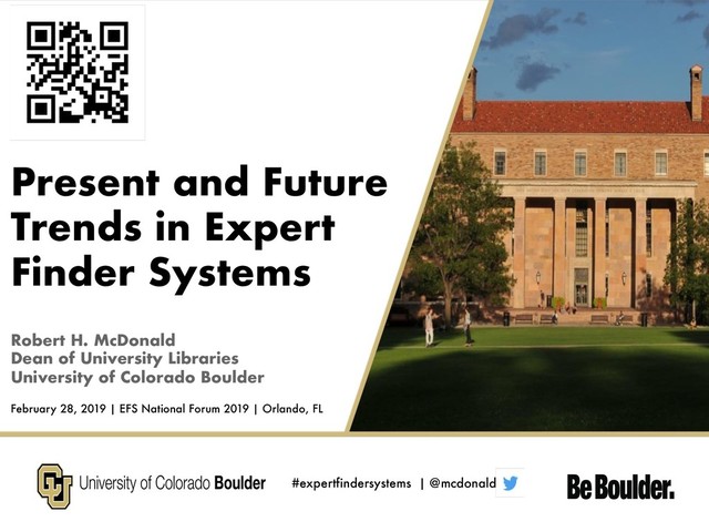 2019 | EFS National Forum 2019 | Orlando, FL Robert H. McDonald Dean of University Libraries University of Colorado Boulder #expertfindersystems | @mcdonald