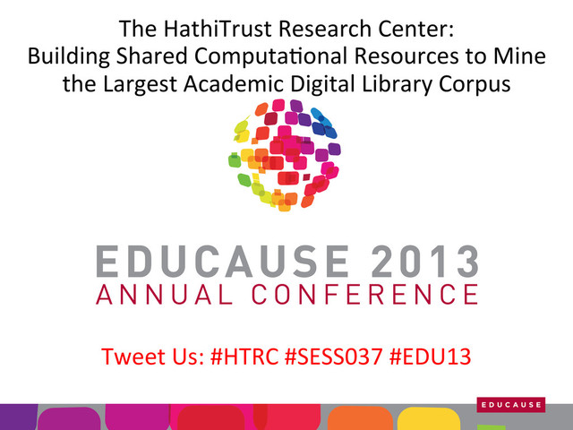 This is the presentation that we gave at #EDU13 on Oct 16, 2013 with other members of the HTRC Executive Committee John Unsworth | @unsworth and Beth Sandore Namachchivaya.