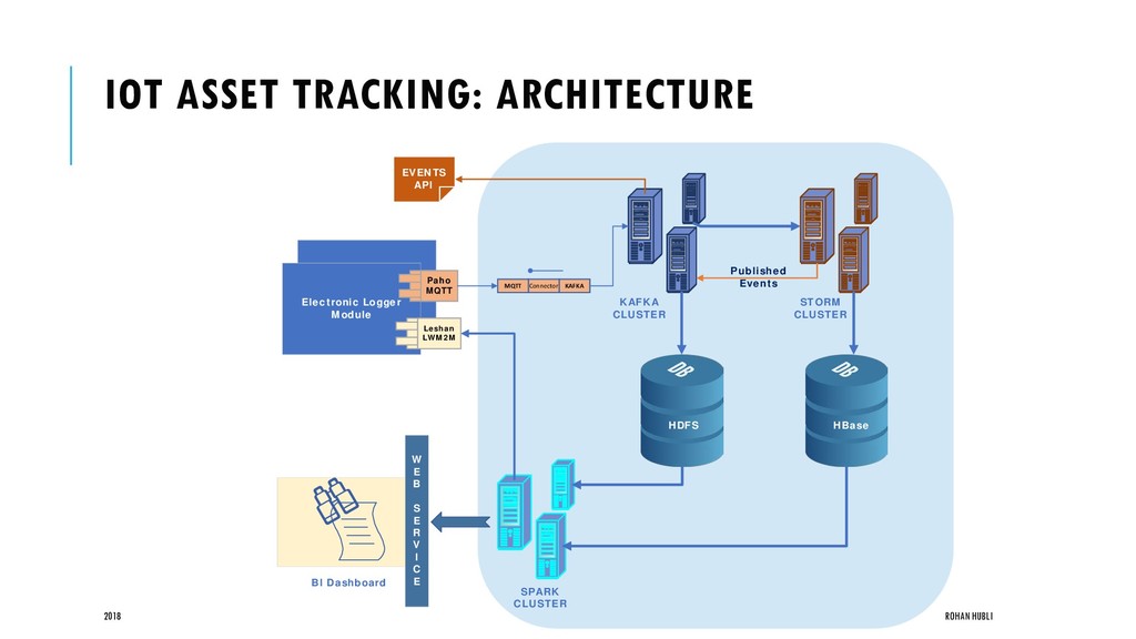 Electronic Logger Module Paho MQTT Leshan LWM2M KAFKA Connector MQTT KAFKA CLUSTER STORM CLUSTER HBase HDFS SPARK CLUSTER BI Dashboard W E B S E R V I C E Published Events EVENTS API