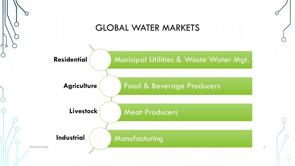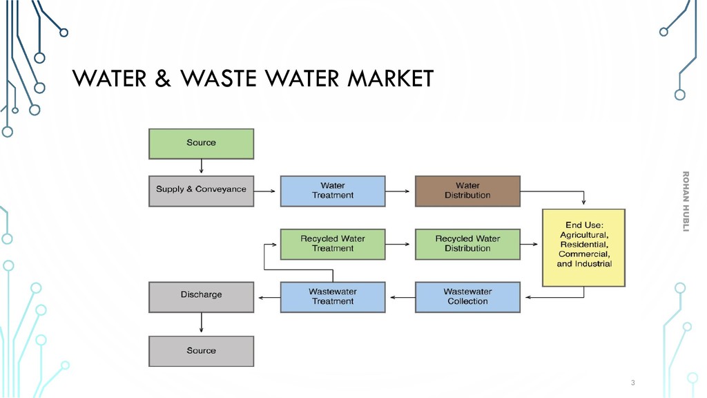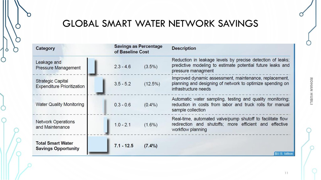 An overview of market opportunity to monitor water distribution networks using smart sensors that can track water quality, usage, leaks and overall health of the water distribution network.