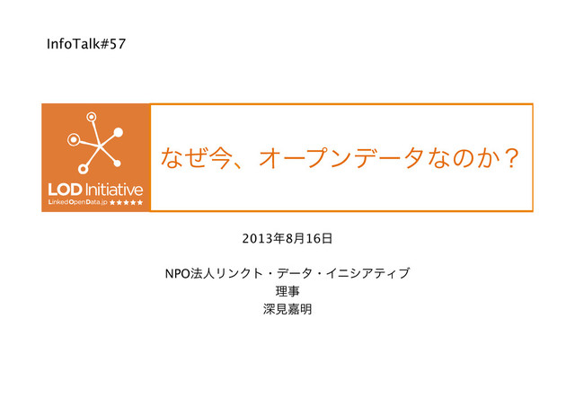 ͳͥࠓɺΦʔϓϯσʔλͳͷ͔ʁ 20138݄16 NPO๏ਓϦϯΫτɾσʔλɾΠχγΞςΟϒ ཧࣄ ਂݟՅ໌ InfoTalk#57