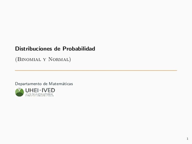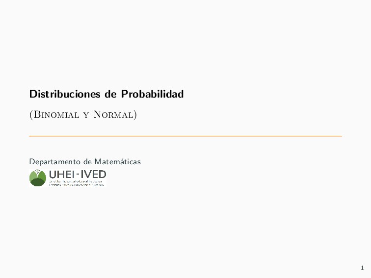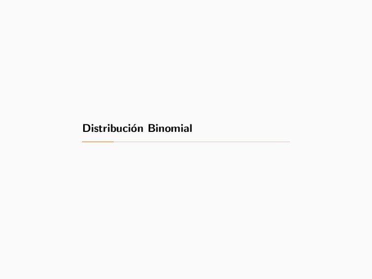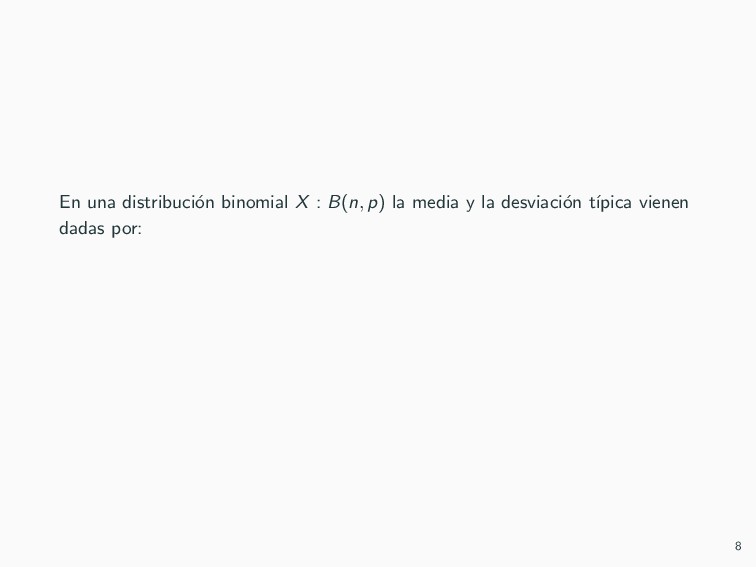 ´ exitos viene dado por: Probabilidad de k ´ exitos X : B(n, p) → p(X = k) = n k pk qn−k Donde: 1. pk qn−k es la probabilidad de que aparezcan k ´ exitos y n − k fracasos, por ejemplo, que los ´ exitos sean los primeros k y los fracasos los ´ ultimos n − k AA · · · A k aciertos ¯ A ¯ A · · · ¯ A n−k fracasos 2. n k nos indica el n´ umero de formas en las que pueden aparecer esos k ´ exitos 7