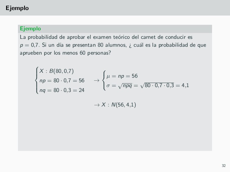 del carnet de conducir es p = 0,7. Si un d´ ıa se presentan 80 alumnos, ¿ cu´ al es la probabilidad de que aprueben por los menos 60 personas? X : B(80, 0,7) np = 80 · 0,7 = 56 nq = 80 · 0,3 = 24 → µ = np = 56 σ = √ npq = √ 80 · 0,7 · 0,3 = 4,1 32