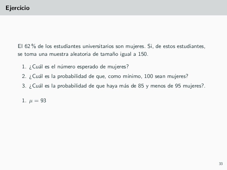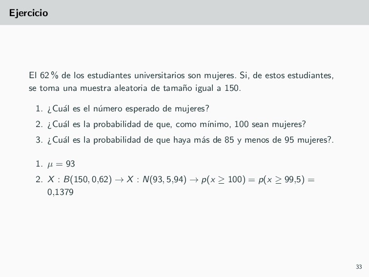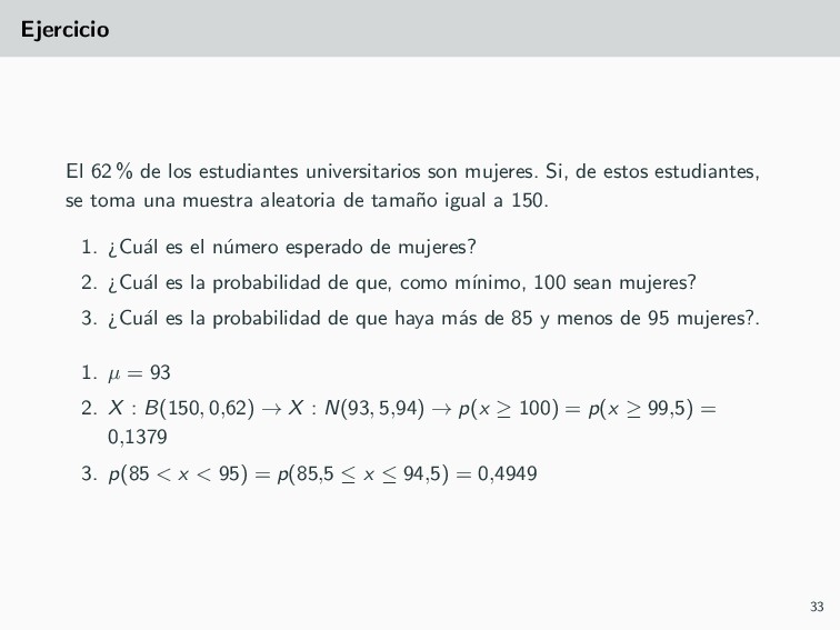 Si, de estos estudiantes, se toma una muestra aleatoria de tama˜ no igual a 150. 1. ¿Cu´ al es el n´ umero esperado de mujeres? 2. ¿Cu´ al es la probabilidad de que, como m´ ınimo, 100 sean mujeres? 3. ¿Cu´ al es la probabilidad de que haya m´ as de 85 y menos de 95 mujeres?. 1. µ = 93 2. X : B(150, 0,62) → X : N(93, 5,94) → p(x ≥ 100) = p(x ≥ 99,5) = 0,1379 33