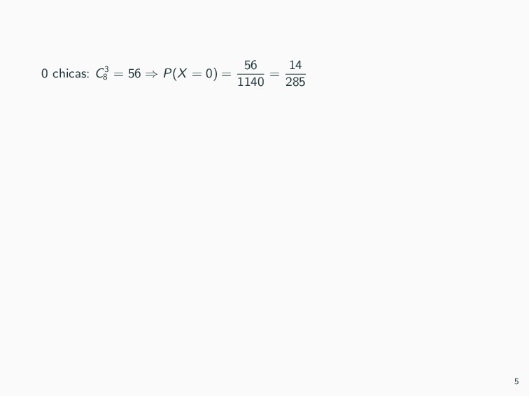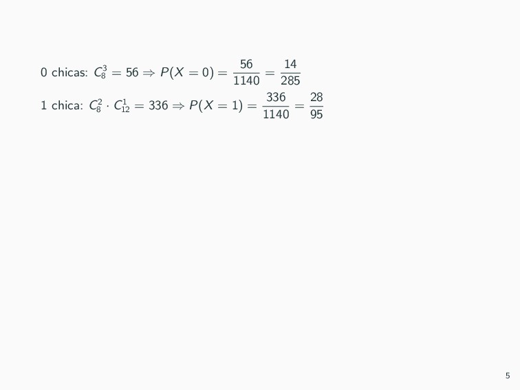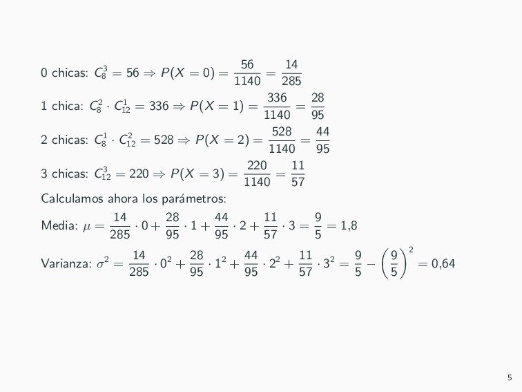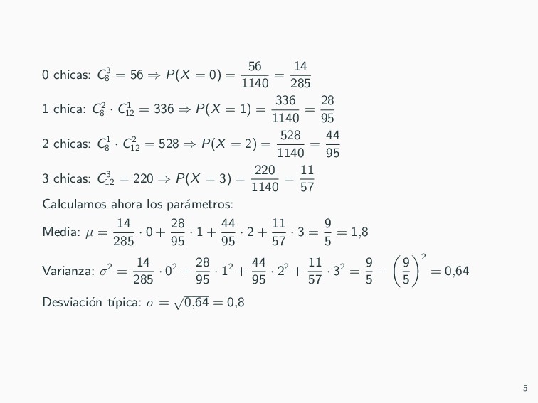 3 alumnos de una clase formada por 20, de los cuales 8 son chicos y 12 chicas. Se considera la variable aleatoria, X, que cuenta el n´ umero de chicas que aparecen en la muestra. Calcula los valores de la variable aleatoria y sus probabilidades. Calcula los par´ ametros de esta variable aleatoria. Los valores de la variable aleatoria son: X = {0, 1, 2, 3} Vamos a utilizar la combinatoria y la regla de Laplace para el c´ alculo de las probabilidades. Si hay 20 alumnos y tomamos 3 los posibles grupos son C3 20 = 1140 Calculamos cuantos grupos hay seg´ un el n´ umero de chicas y dividiendo entre el n´ umero total de grupos tendremos su probabilidad: 4