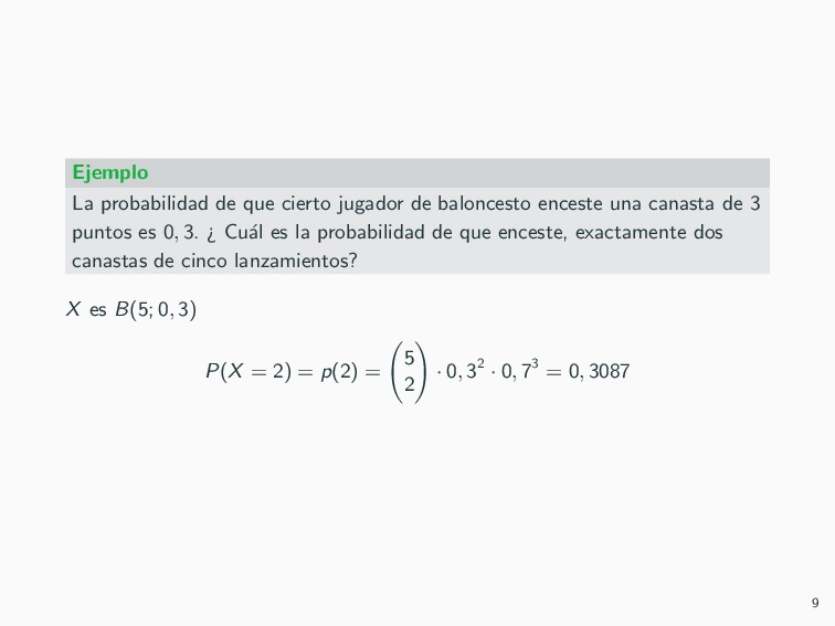 una canasta de 3 puntos es 0, 3. ¿ Cu´ al es la probabilidad de que enceste, exactamente dos canastas de cinco lanzamientos? X es B(5; 0, 3) P(X = 2) = p(2) = 5 2 · 0, 32 · 0, 73 = 0, 3087 9