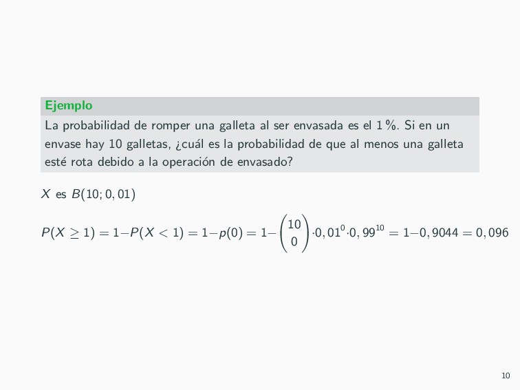 es el 1 %. Si en un envase hay 10 galletas, ¿cu´ al es la probabilidad de que al menos una galleta est´ e rota debido a la operaci´ on de envasado? X es B(10; 0, 01) 10