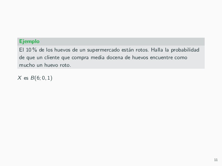 est´ an rotos. Halla la probabilidad de que un cliente que compra media docena de huevos encuentre como mucho un huevo roto. X es B(6; 0, 1) P(X ≤ 1) = p(0) + p(1) = 6 0 · 0, 10 · 0, 96 + 6 1 · 0, 11 · 0, 95 = = 0, 5314 + 0, 3543 = 0, 8857 11