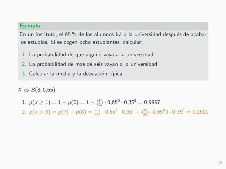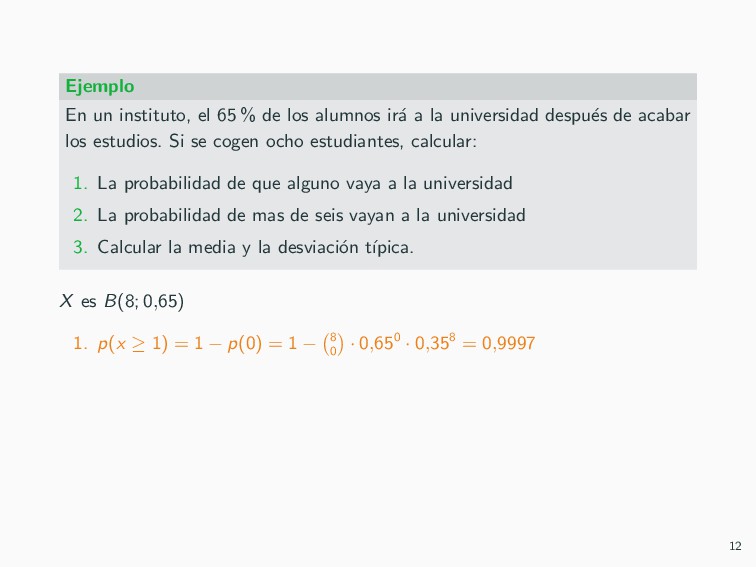 ir´ a a la universidad despu´ es de acabar los estudios. Si se cogen ocho estudiantes, calcular: 1. La probabilidad de que alguno vaya a la universidad 2. La probabilidad de mas de seis vayan a la universidad 3. Calcular la media y la desviaci´ on t´ ıpica. X es B(8; 0,65) 1. p(x ≥ 1) = 1 − p(0) = 1 − 8 0 · 0,650 · 0,358 = 0,9997 2. p(x > 6) = p(7) + p(8) = 8 7 · 0,657 · 0,351 + 8 8 · 0,6580 · 0,350 = 0,1691 12
