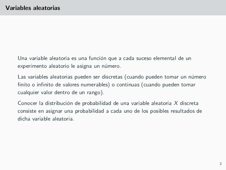 a cada suceso elemental de un experimento aleatorio le asigna un n´ umero. Las variables aleatorias pueden ser discretas (cuando pueden tomar un n´ umero finito o infinito de valores numerables) o continuas (cuando pueden tomar cualquier valor dentro de un rango). Conocer la distribuci´ on de probabilidad de una variable aleatoria X discreta consiste en asignar una probabilidad a cada uno de los posibles resultados de dicha variable aleatoria. 2