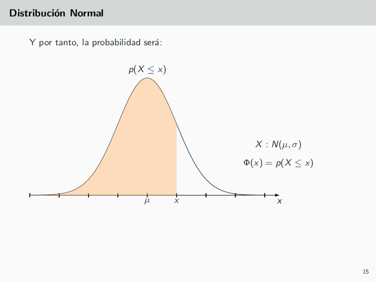 on de probabilidad continua descrita por primera vez por el matem´ atico alem´ an Gauss, conoci´ endola como campana de Gauss. Para cada valor de µ y de σ hay una distribuci´ on normal con funci´ on de densidad: f (x) = 1 σ √ 2π e − 1 2 x − µ σ 2 14