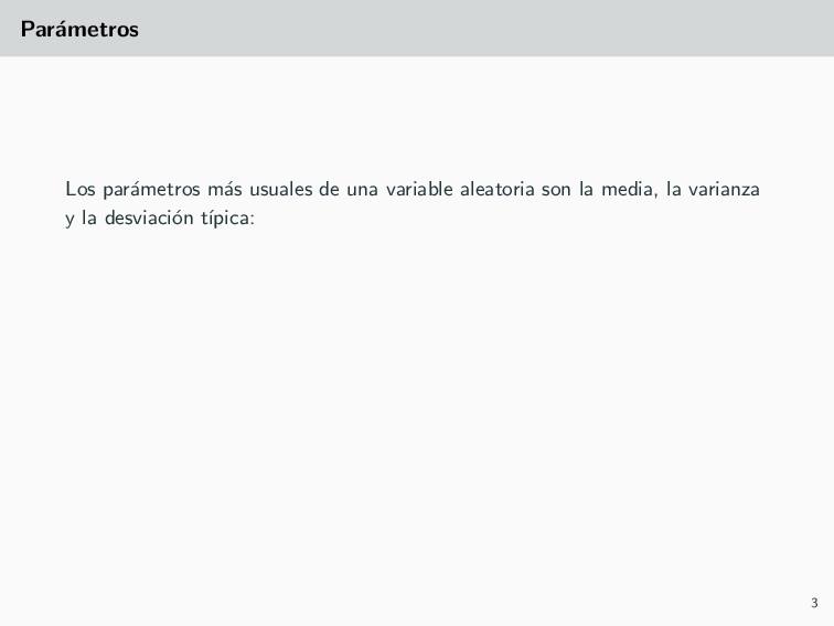 variable aleatoria son la media, la varianza y la desviaci´ on t´ ıpica: Media (µ) µ = n i=1 pi · xi = p1 · x1 + p2 · x2 + · · · + pn · xn Varianza (σ2) σ = n i=1 pi · (xi − µ)2 = n i=1 pi · x2 i − µ2 Desviaci´ on t´ ıpica (σ) σ = n i=1 pi · (xi − µ)2 = n i=1 pi · x2 i − µ2 3