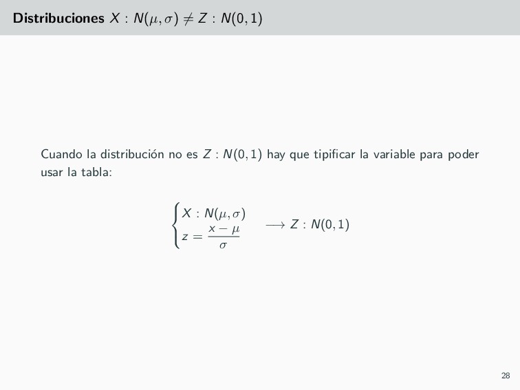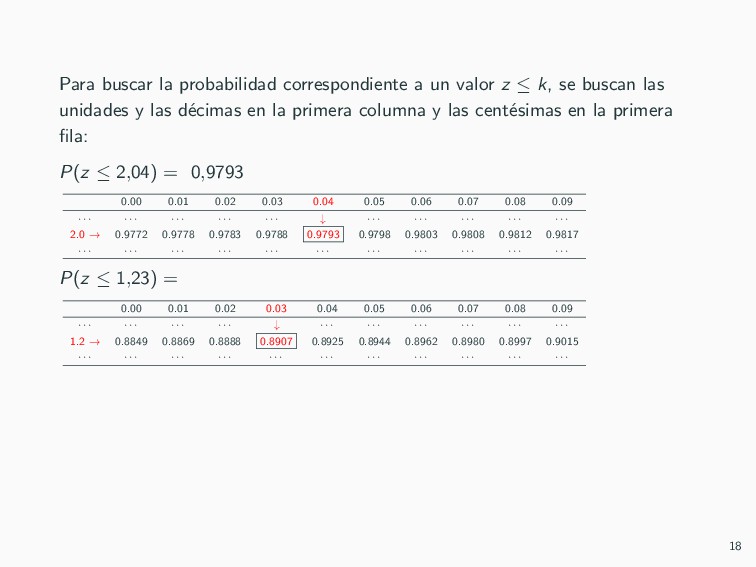 N(0, 2), X : N(5, 2) y X : N(5, 1) x µ = 0 µ = 5 N(0, 2) N(5, 2) N(5, 1) Las distribuciones normales que tienen la misma desviaci´ on t´ ıpica tienen la misma gr´ afica pero desplazada. Cuanto m´ as grande es la desviaci´ on t´ ıpica mas achatada ser´ a la gr´ afica. Para calcular las probabilidades con la distribuci´ on normal Z : N(0, 1) se usa la siguiente tabla. 16