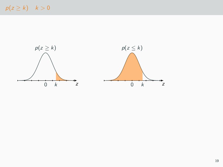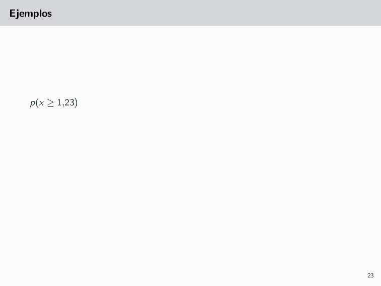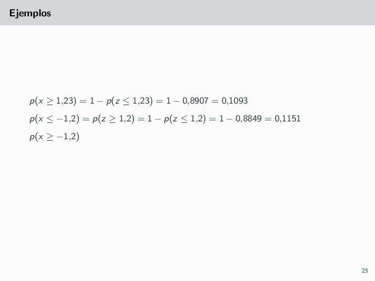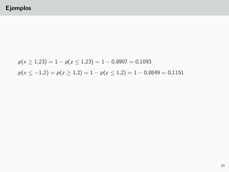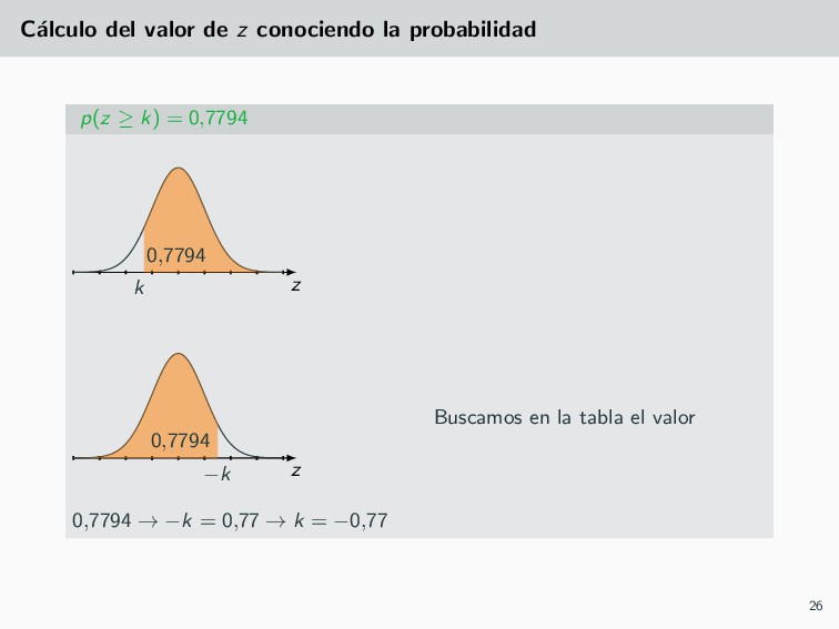 probabilidades que aparecen en la tabla siempre son mayores o iguales que 0,5 o menores o iguales 1 y siempre asociadas al signo ≤, estudiemos los casos que pueden aparecer: p(z ≤ k) ≥ 0,5 p(z ≤ k) = 0,7834 Es la situaci´ on de la tabla y s´ olo hay que buscar dicha probabilidad. En nuestro caso, la probabilidad no aparece siendo las mas cercanas: p(z ≤ 0,78) = 0,7823 p(z ≤ 0,79) = 0,7852 Nuestra probabilidad est´ a casi en medio de las dos y por tanto cogeremos el valor del medio: k = 0,78 + 0,79 2 = 0,785 24