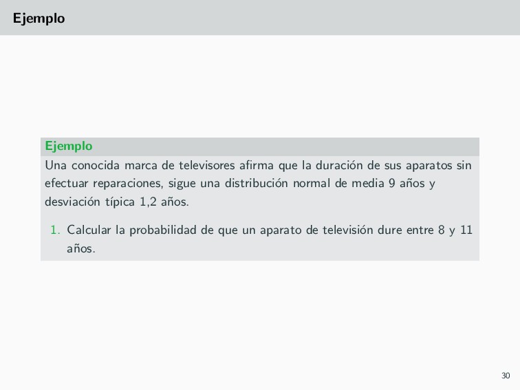 probabilidad p(x ≤ 10) = p z ≤ 10 − 7 2 = p(z ≤ 1,5) = 0,9932 2. C´ alculo del valor p(x ≤ k) = 0,25 → p z ≤ k − 7 2 = 0,25 z k − 7 2 0,25 z − k − 7 2 0,75 0,25 Buscamos 0,75 en la tabla y: − k − 7 2 = 0,675 → k − 7 2 = −0,675 → k = 7 − 2 · (0,675) = 5,65 29