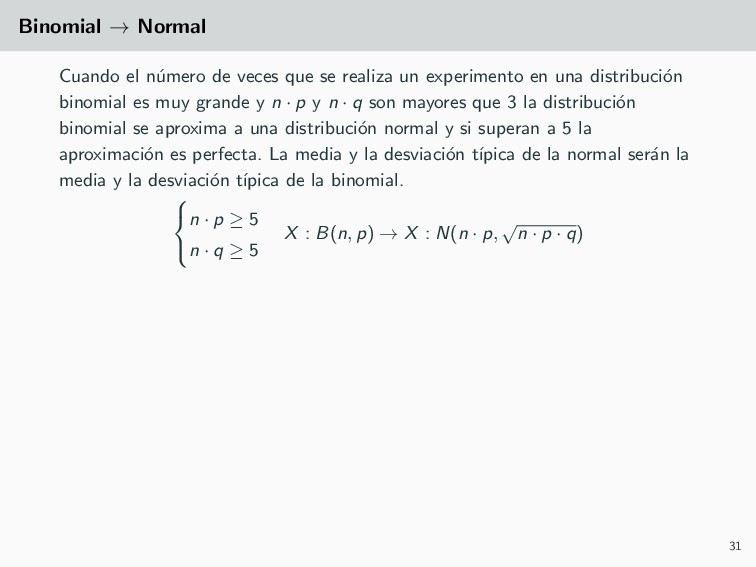se realiza un experimento en una distribuci´ on binomial es muy grande y n · p y n · q son mayores que 3 la distribuci´ on binomial se aproxima a una distribuci´ on normal y si superan a 5 la aproximaci´ on es perfecta. La media y la desviaci´ on t´ ıpica de la normal ser´ an la media y la desviaci´ on t´ ıpica de la binomial. n · p ≥ 5 n · q ≥ 5 X : B(n, p) → X : N(n · p, √ n · p · q) 31