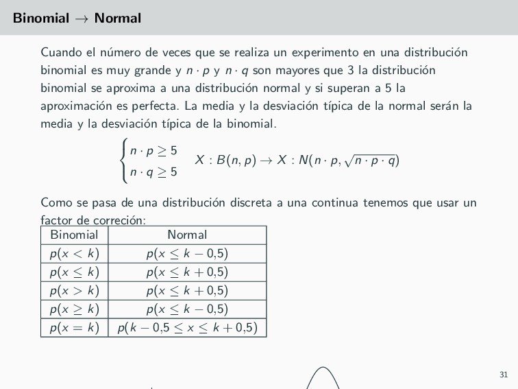 se realiza un experimento en una distribuci´ on binomial es muy grande y n · p y n · q son mayores que 3 la distribuci´ on binomial se aproxima a una distribuci´ on normal y si superan a 5 la aproximaci´ on es perfecta. La media y la desviaci´ on t´ ıpica de la normal ser´ an la media y la desviaci´ on t´ ıpica de la binomial. n · p ≥ 5 n · q ≥ 5 X : B(n, p) → X : N(n · p, √ n · p · q) Como se pasa de una distribuci´ on discreta a una continua tenemos que usar un factor de correci´ on: Binomial Normal p(x < k) p(x ≤ k − 0,5) p(x ≤ k) p(x ≤ k + 0,5) p(x > k) p(x ≤ k + 0,5) p(x ≥ k) p(x ≤ k − 0,5) p(x = k) p(k − 0,5 ≤ x ≤ k + 0,5) 31