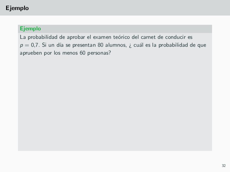 del carnet de conducir es p = 0,7. Si un d´ ıa se presentan 80 alumnos, ¿ cu´ al es la probabilidad de que aprueben por los menos 60 personas? X : B(80, 0,7) np = 80 · 0,7 = 56 nq = 80 · 0,3 = 24 32