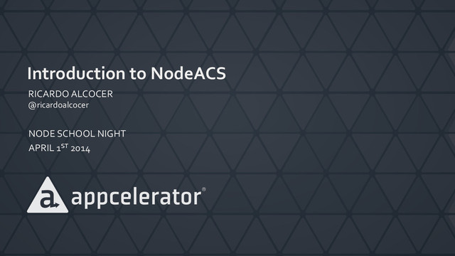 to the Appcelerator Cloud ! Simple CLI interface and built-‐in webserver ! Built-‐in ACS support ! Integrated with Titanium Studio ! It's Javascript but for the server!