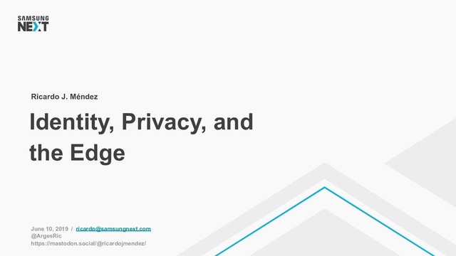 Crocker (BBW) •Wesley Dunnington (Ping Identity) •Jacoby Thwaites (OnFido) •PG, DJ, AL (*) Work in progress… Samsung NEXT Internet Identity Workshop XXVIII * Didn’t hear back about naming them. Privacy and GDPR, y’all!