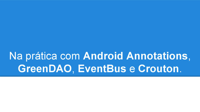 = new Schema(1, "br.com.ricardolonga.todo"); Entity item = schema.addEntity("Item"); item.addIdProperty(); item.addStringProperty("title").notNull(); new DaoGenerator().generateAll(schema, "../todo/src-gen"); } DaoGenerator.java Processing schema version 1... Written /home/longa/dev/workspace/todo/src-gen/br/com/ricardolonga/todo/ItemDao.java Written /home/longa/dev/workspace/todo/src-gen/br/com/ricardolonga/todo/Item.java Written /home/longa/dev/workspace/todo/src-gen/br/com/ricardolonga/todo/DaoMaster.java Written /home/longa/dev/workspace/todo/src-gen/br/com/ricardolonga/todo/DaoSession.java Processed 1 entities in 113ms Resultado...