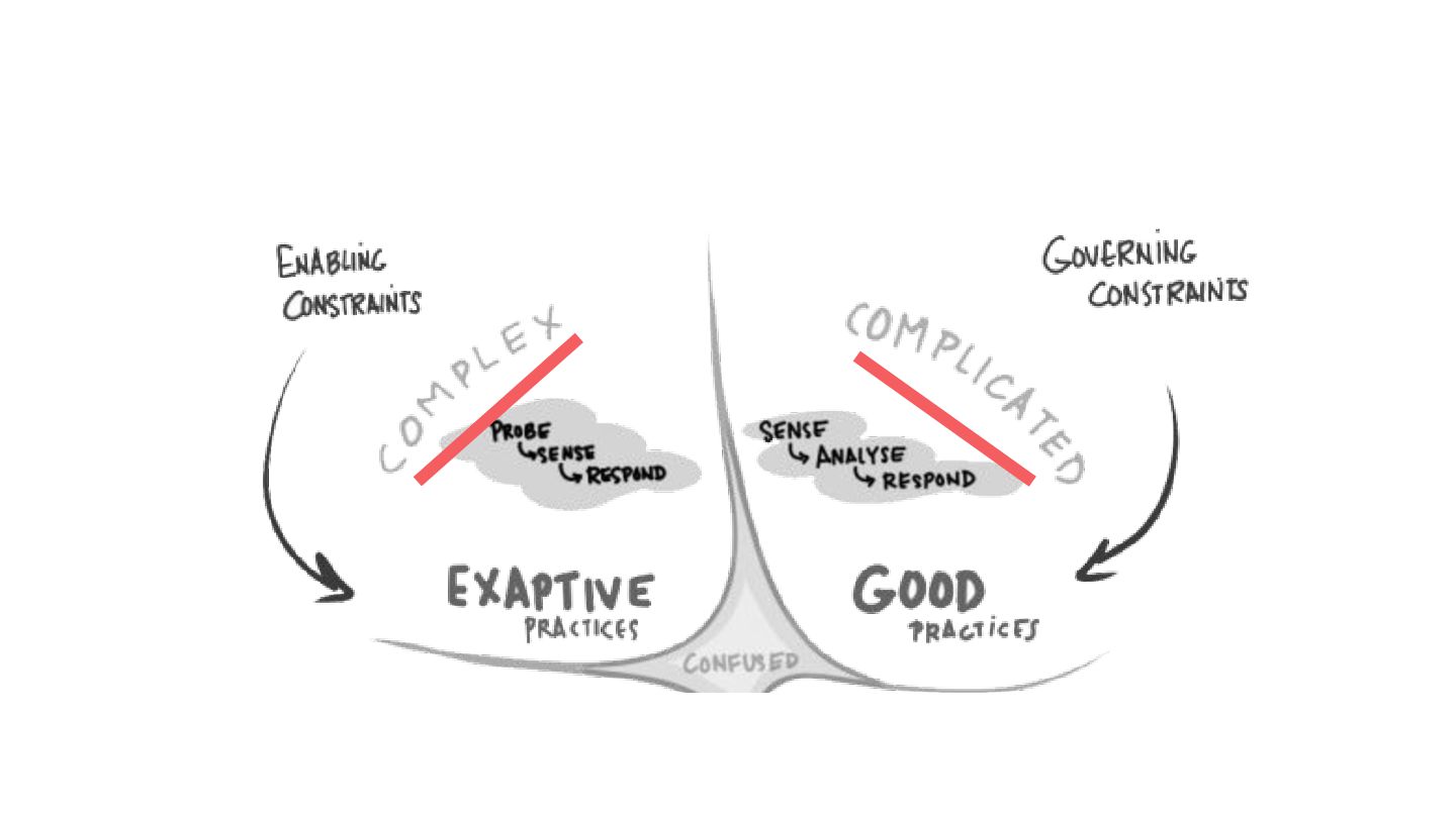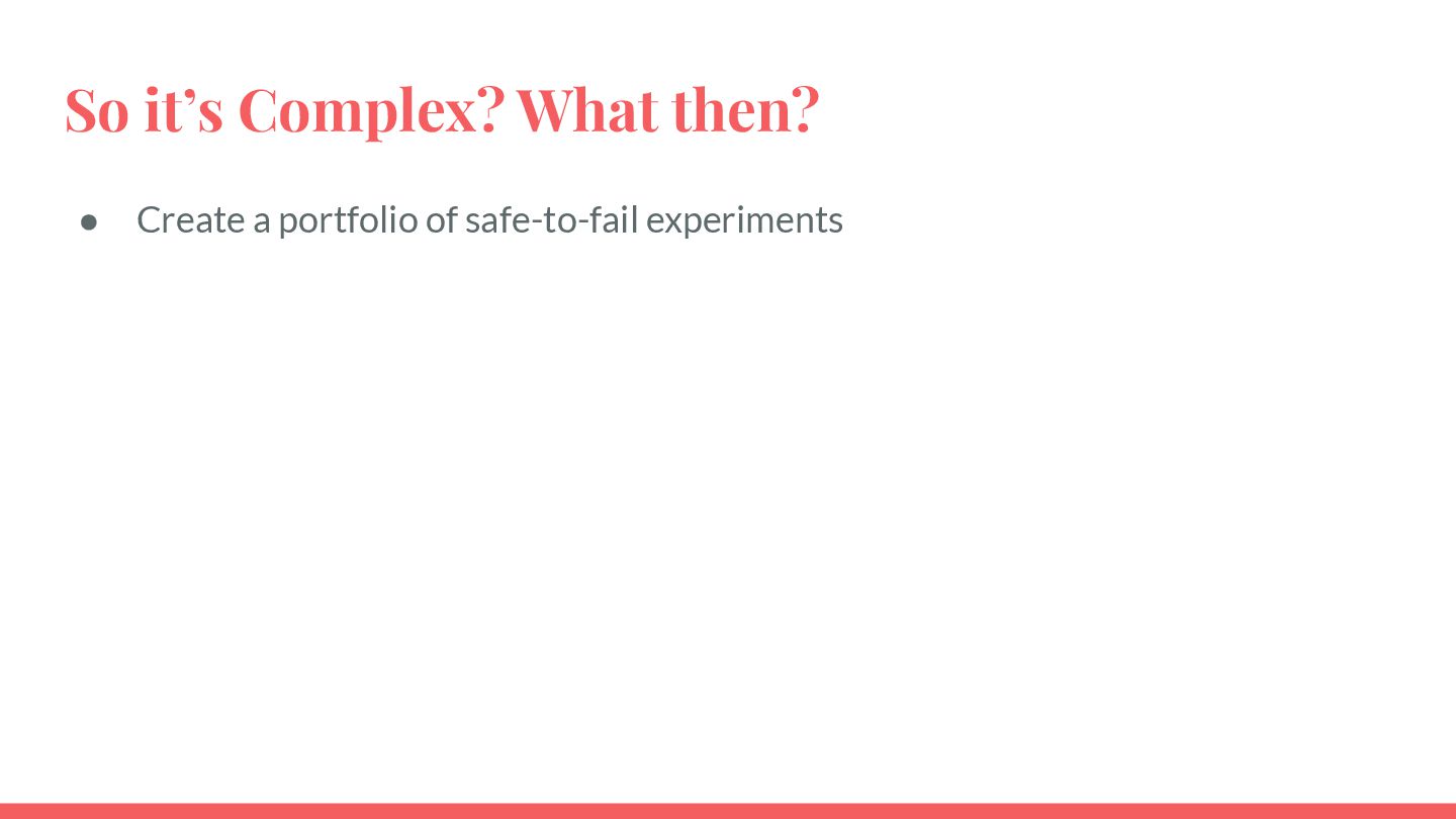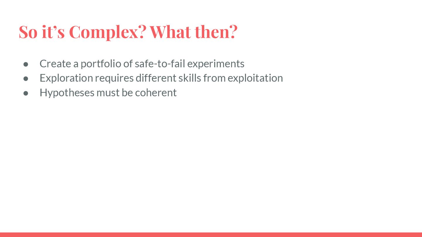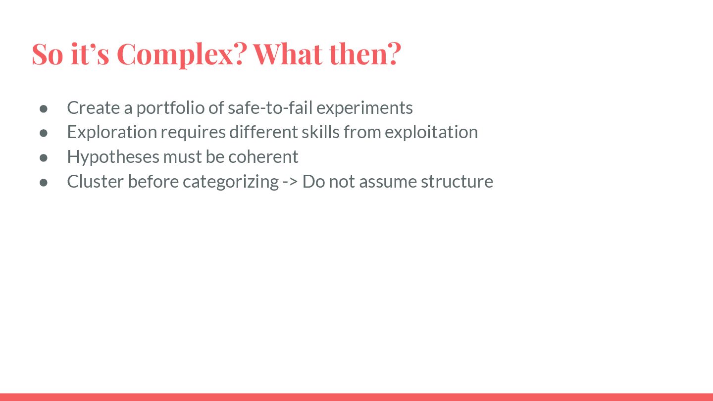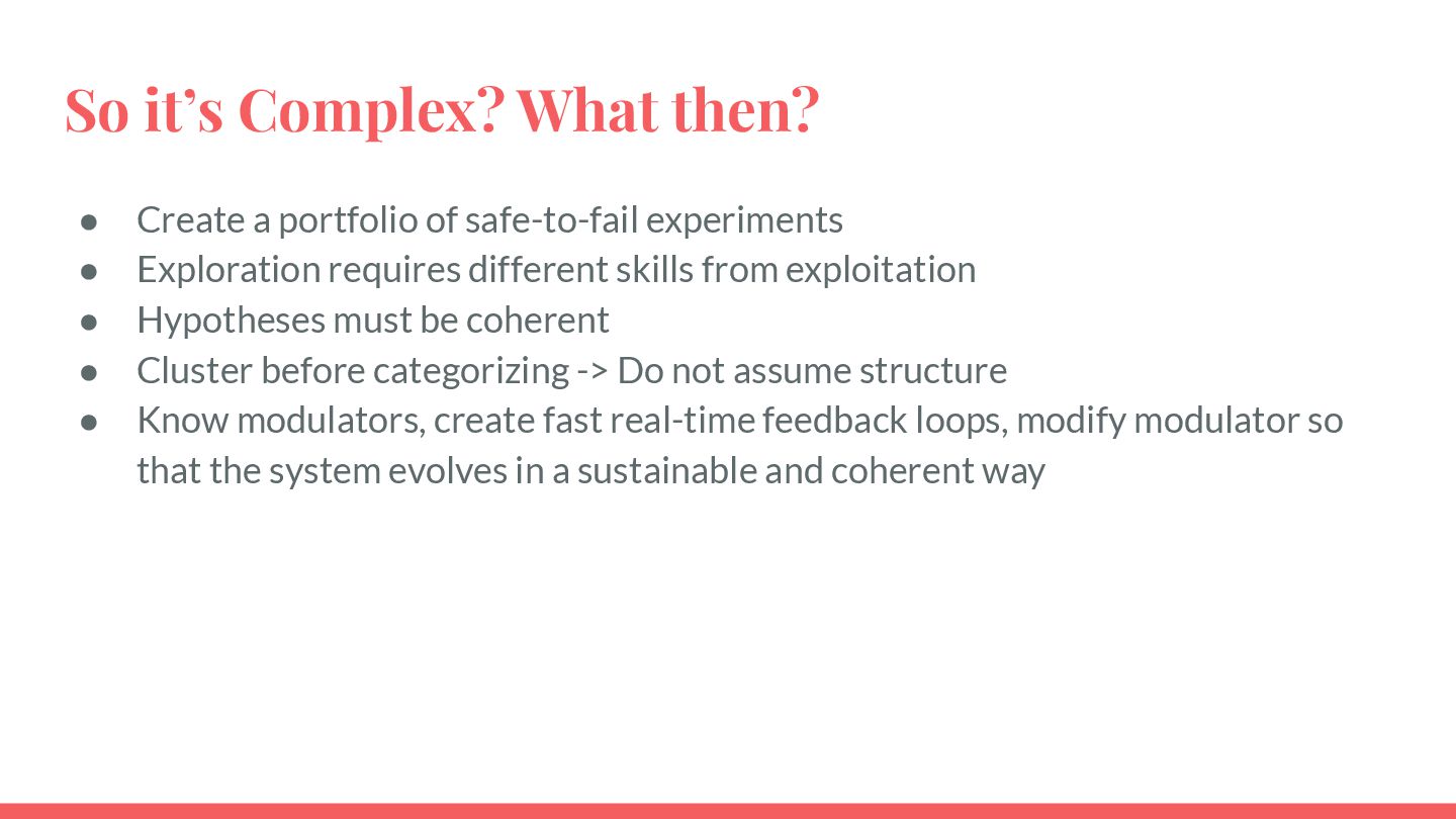 safe-to-fail experiments • Exploration requires different skills from exploitation • Hypotheses must be coherent • Cluster before categorizing -> Do not assume structure • Know modulators, create fast real-time feedback loops, modify modulator so that the system evolves in a sustainable and coherent way