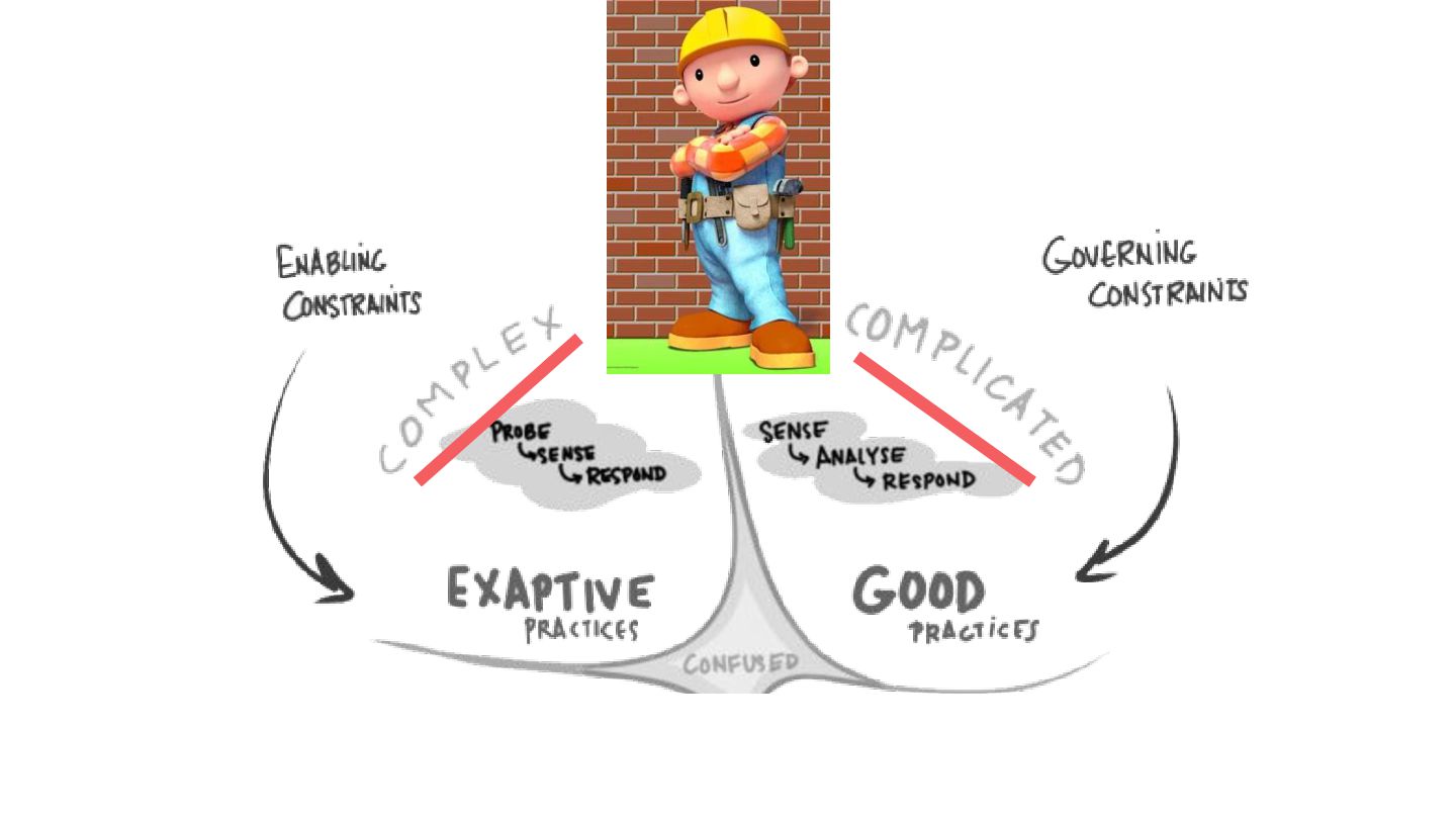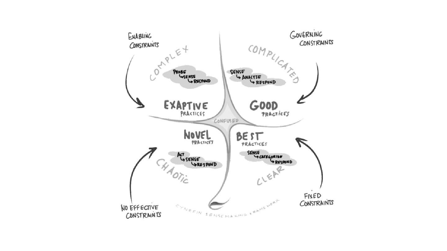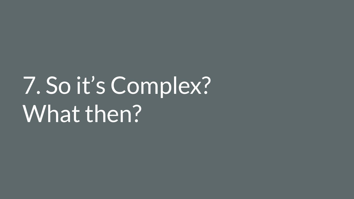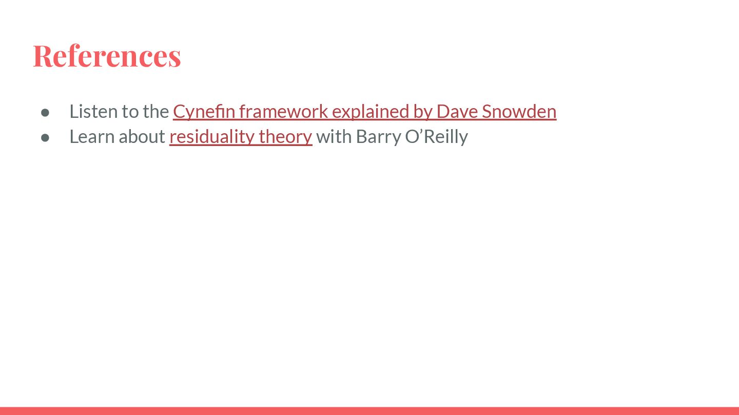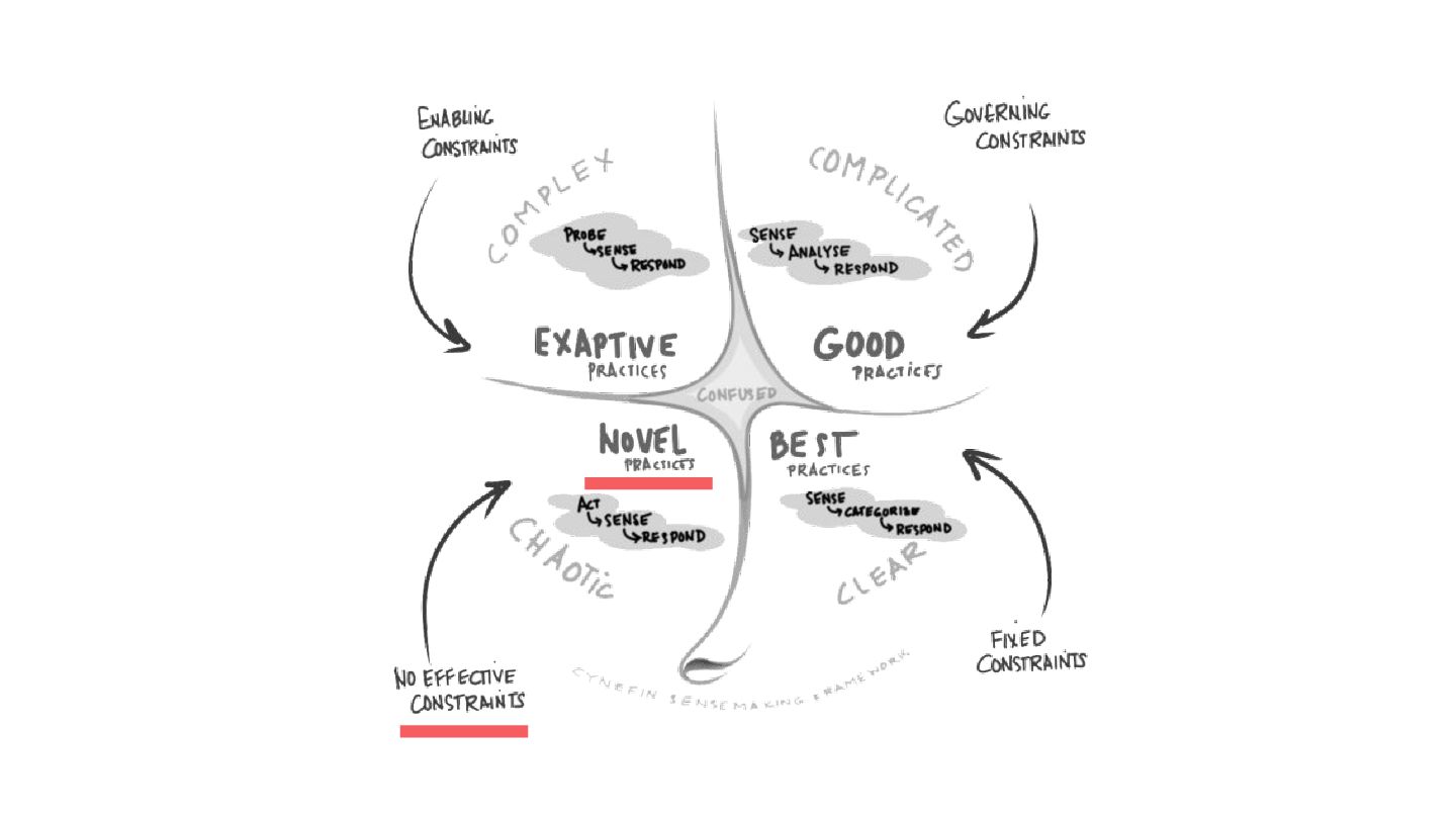 safe-to-fail experiments • Exploration requires different skills from exploitation • Hypotheses must be coherent • Cluster before categorizing -> Do not assume structure • Know modulators, create fast real-time feedback loops, modify modulator so that the system evolves in a sustainable and coherent way