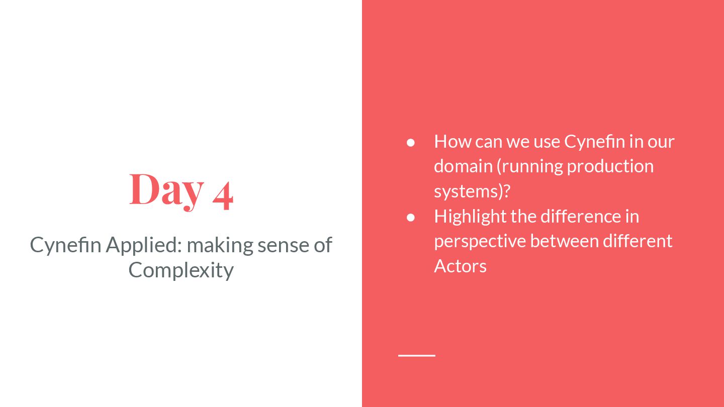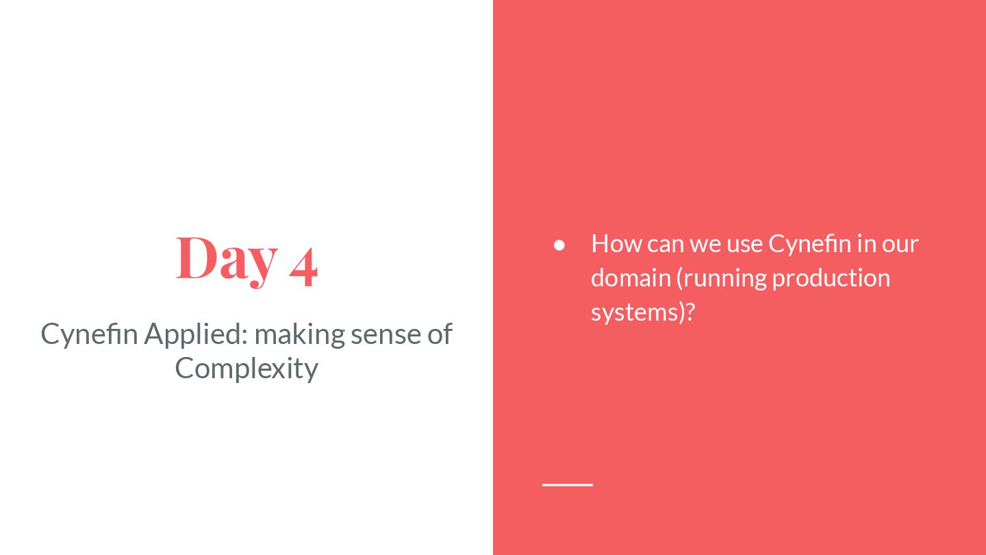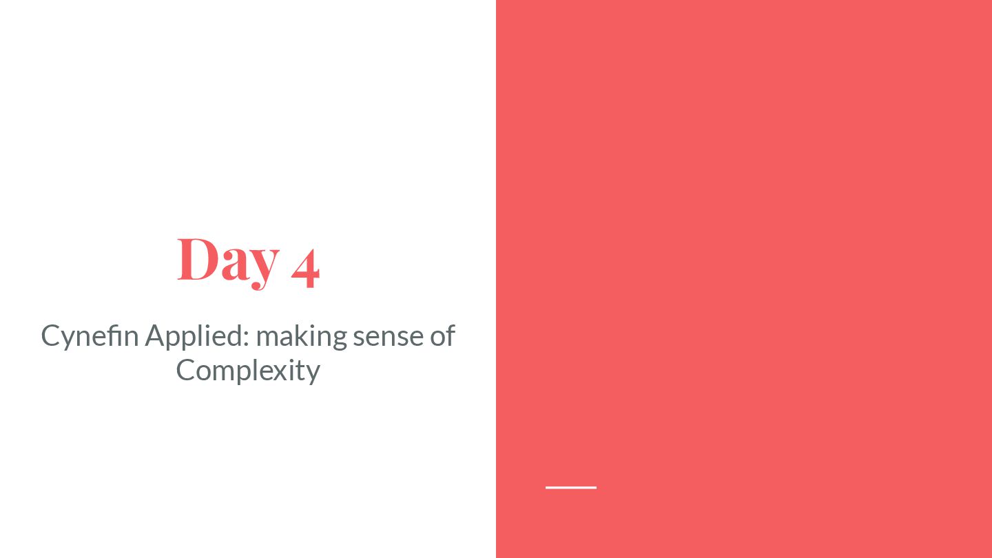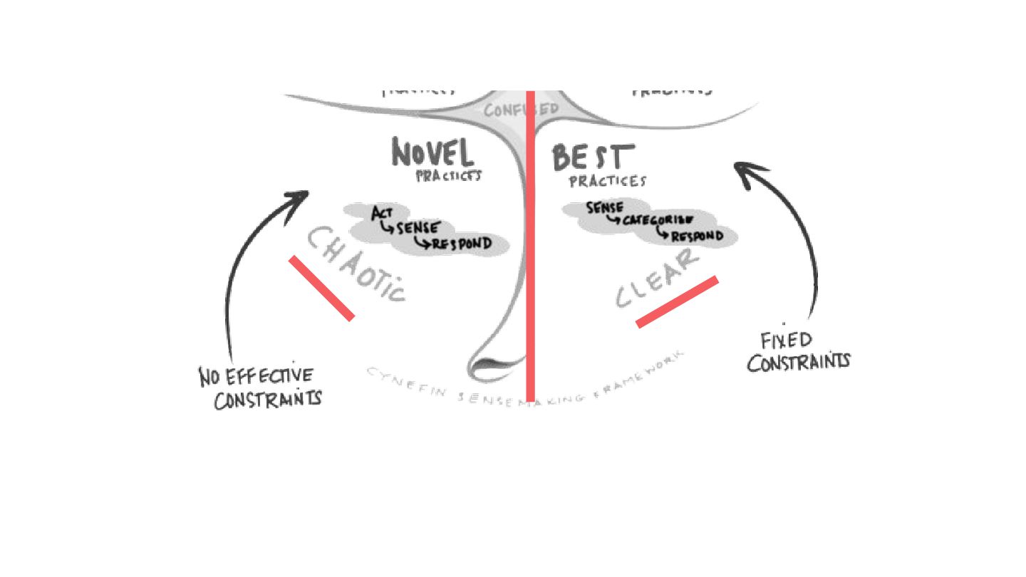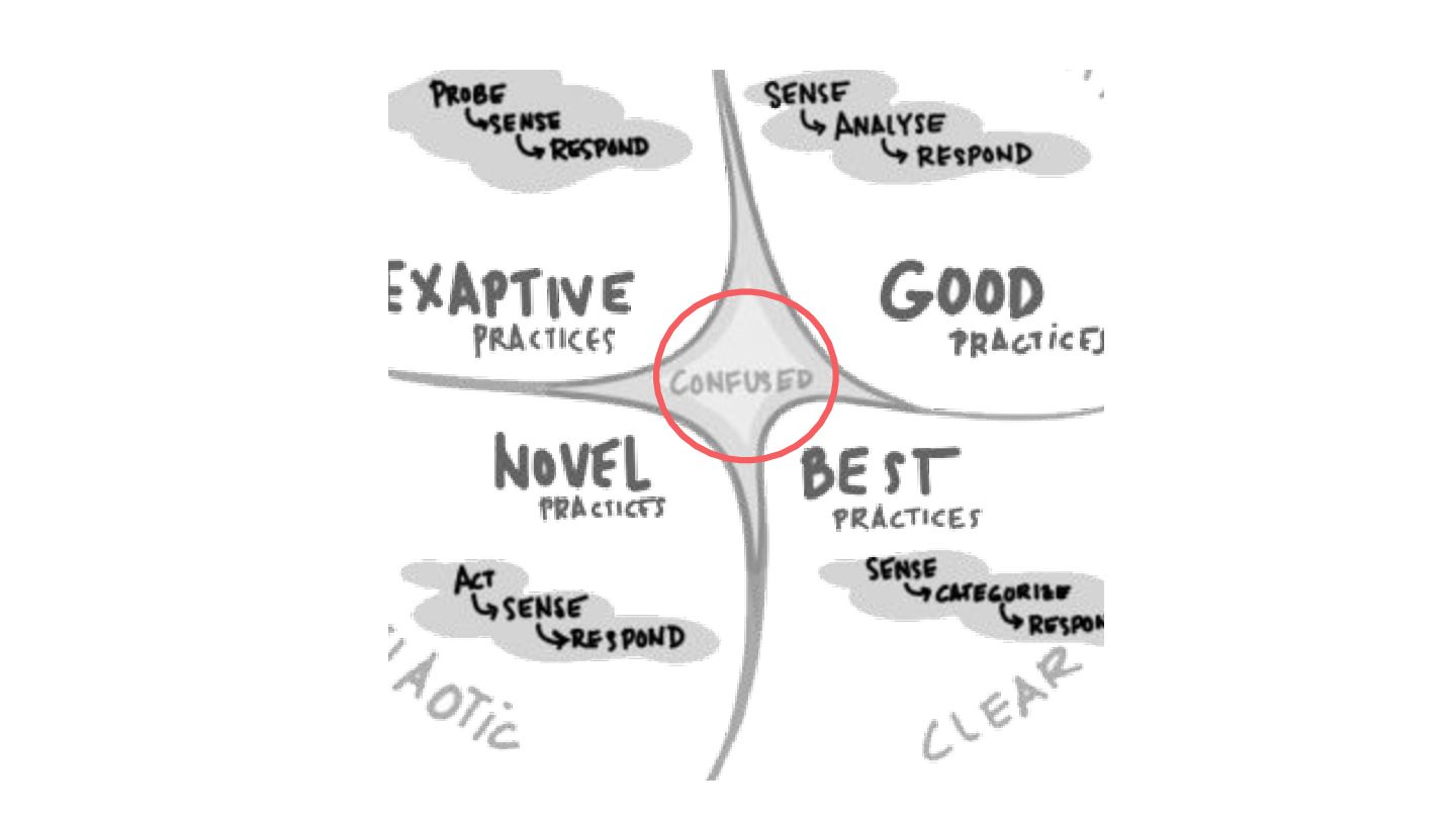 safe-to-fail experiments • Exploration requires different skills from exploitation • Hypotheses must be coherent • Cluster before categorizing -> Do not assume structure • Know modulators, create fast real-time feedback loops, modify modulator so that the system evolves in a sustainable and coherent way