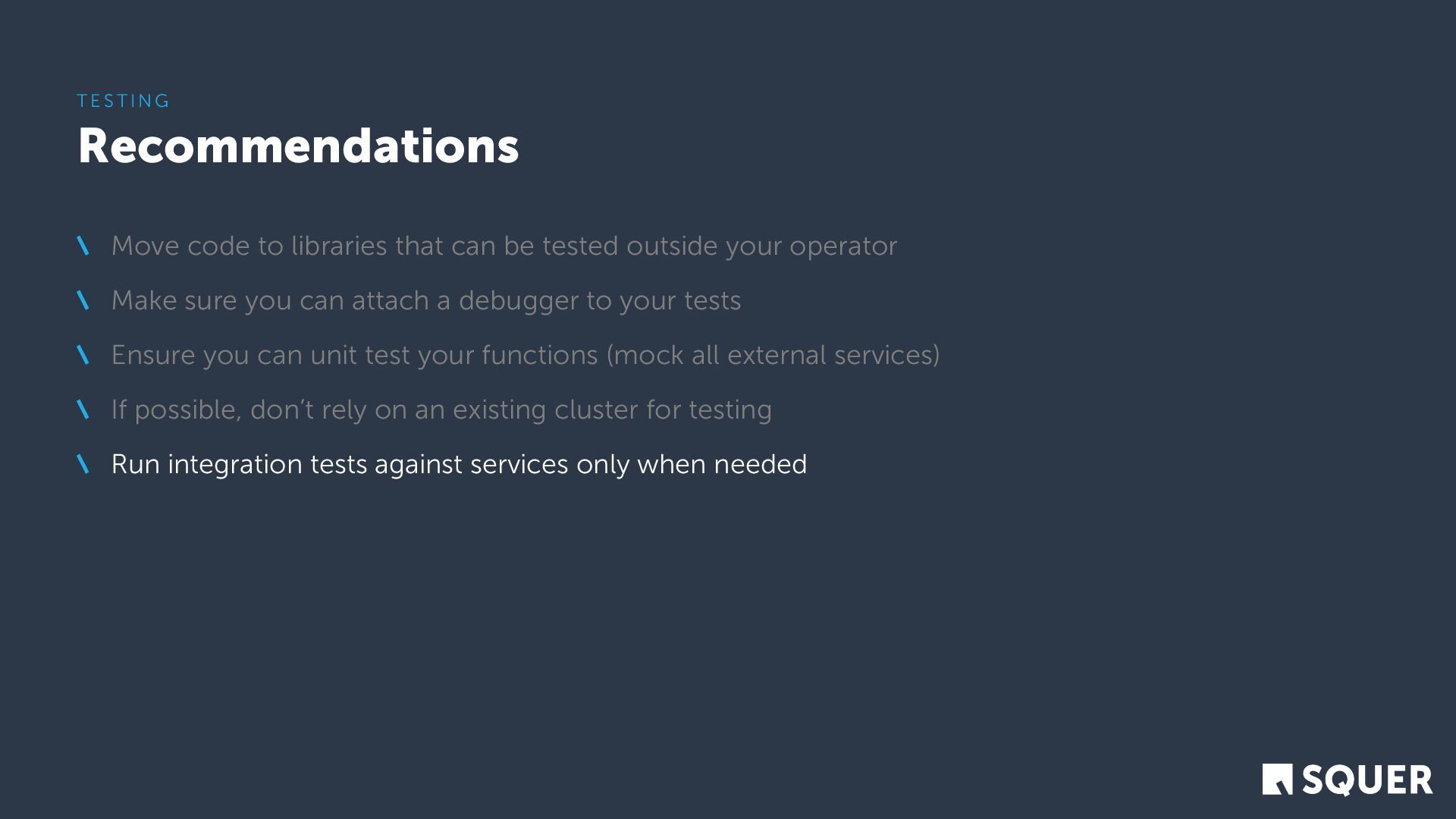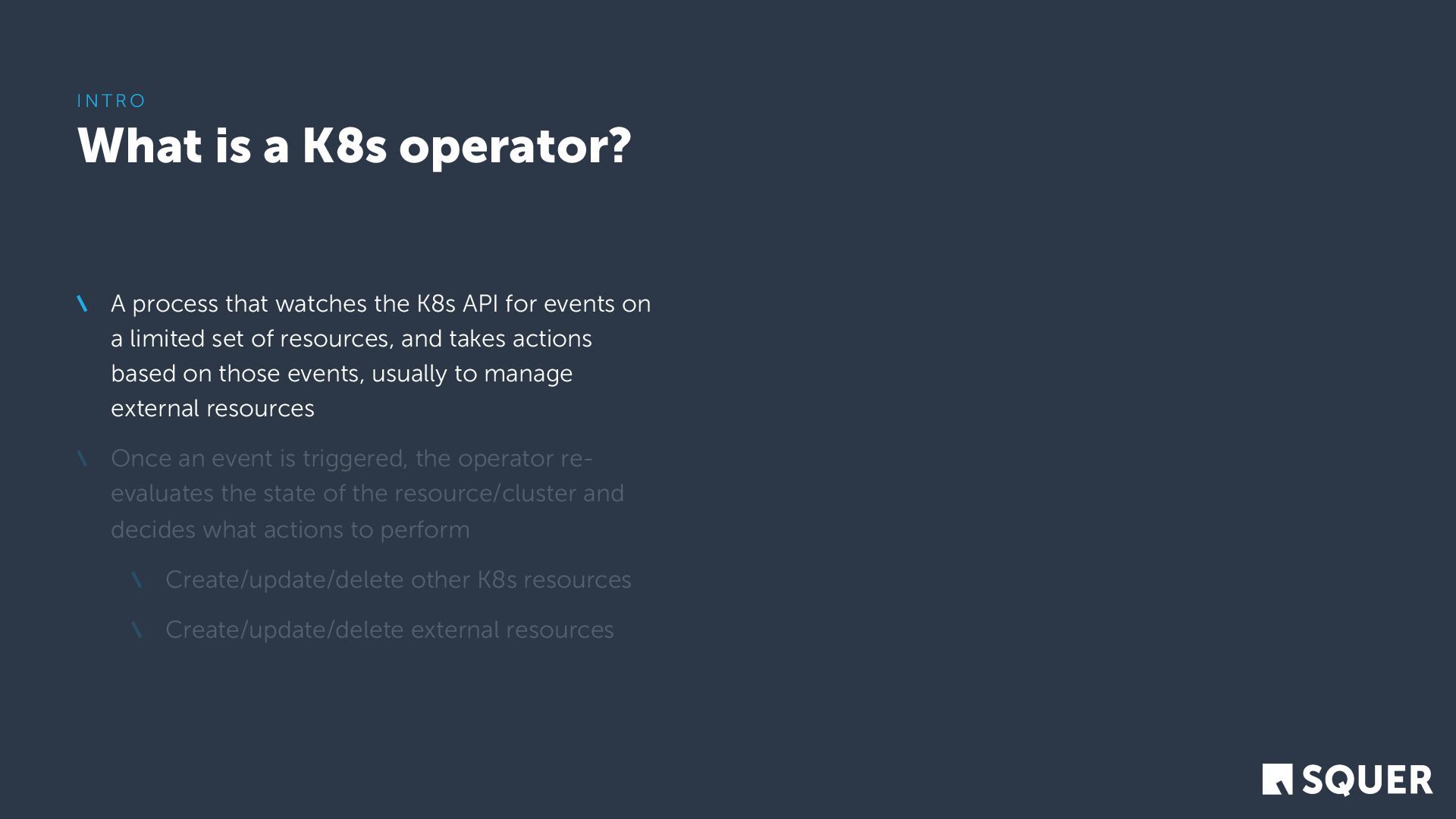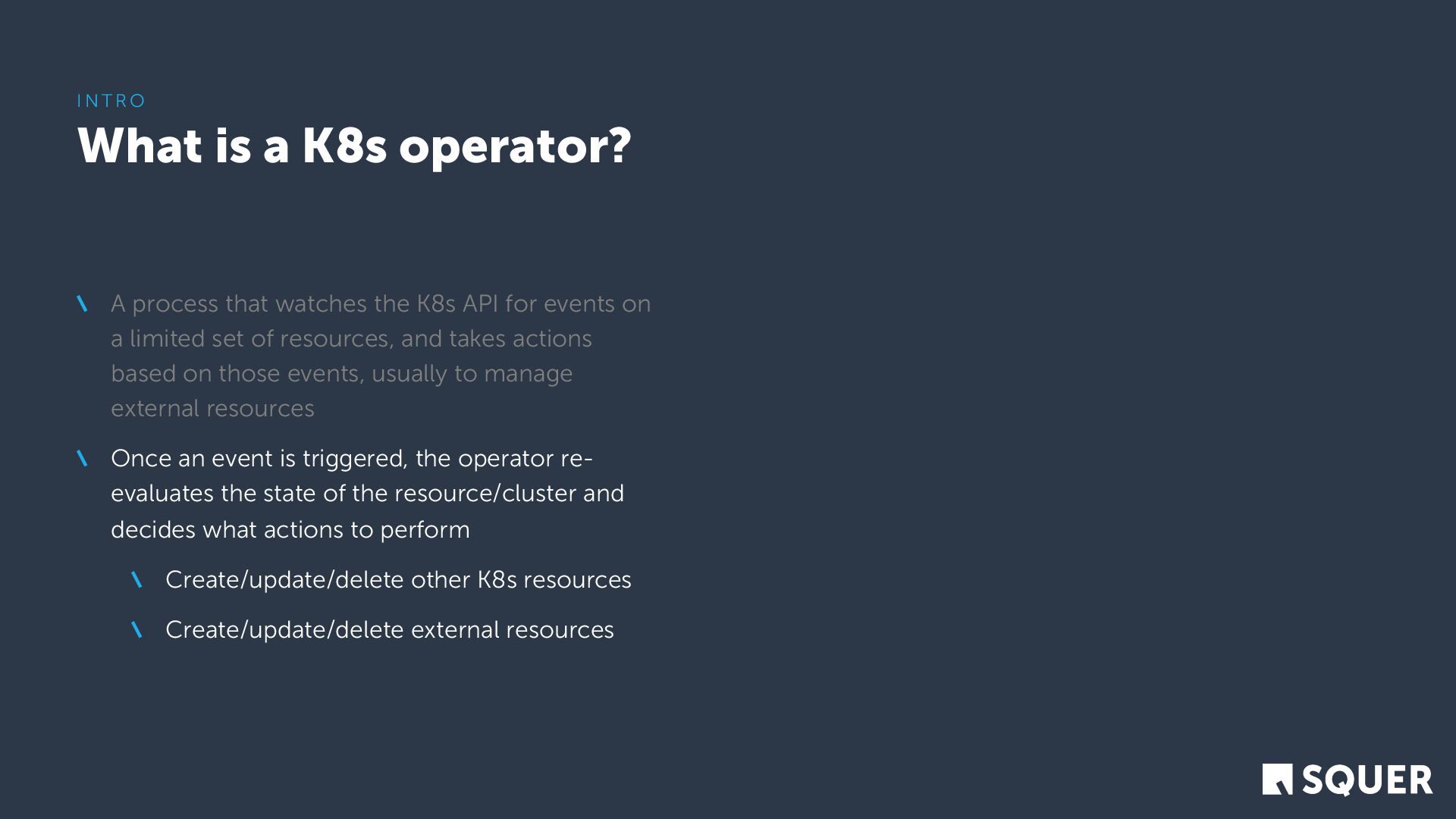 We often hear people talking about Kubernetes (K8s) operators and if you ever used K8s you surely have deployed at least one. However, when the time comes to implement your first operator, it is sometimes challenging to keep in mind what matters and ensure the code we write can be testable, especially when it has to interact with multiple external services.